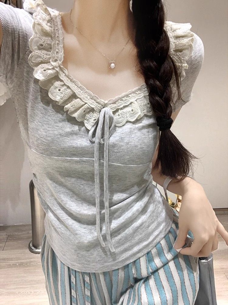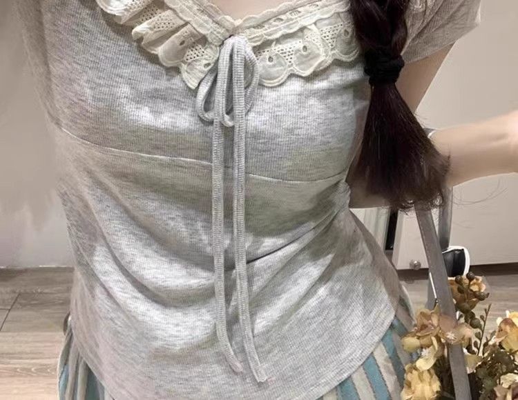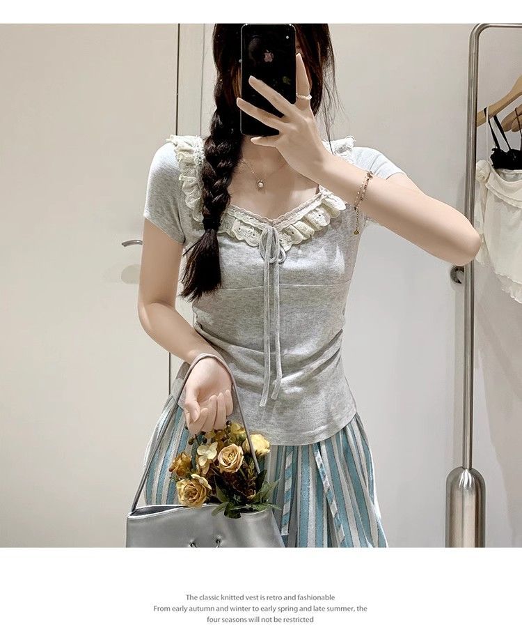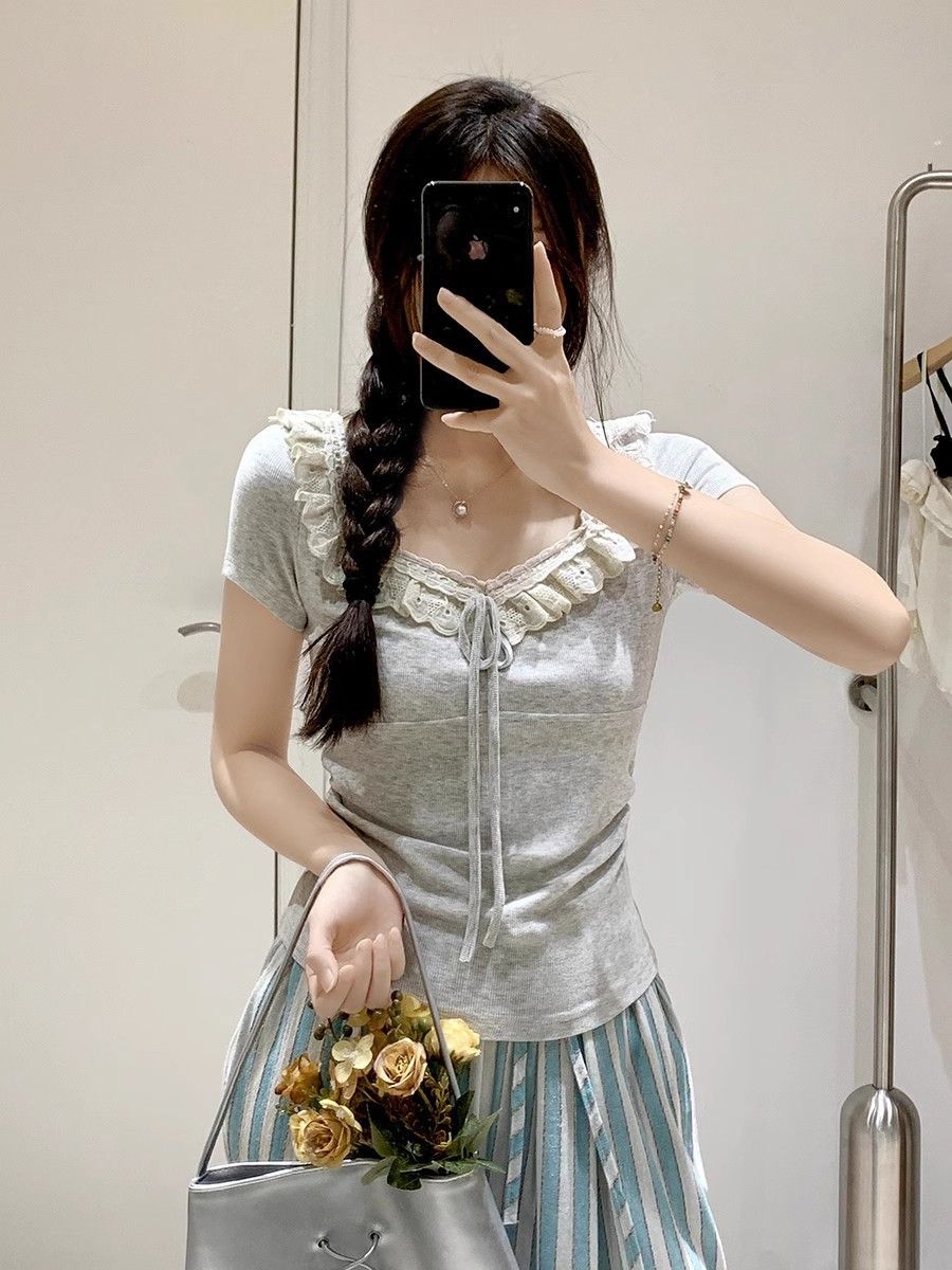 레이스 스티칭 레이스 반팔 티셔츠 여자 여름 2025 새로운 독특한 슈퍼 니스 플리츠 쇼트 탑스토어 가기