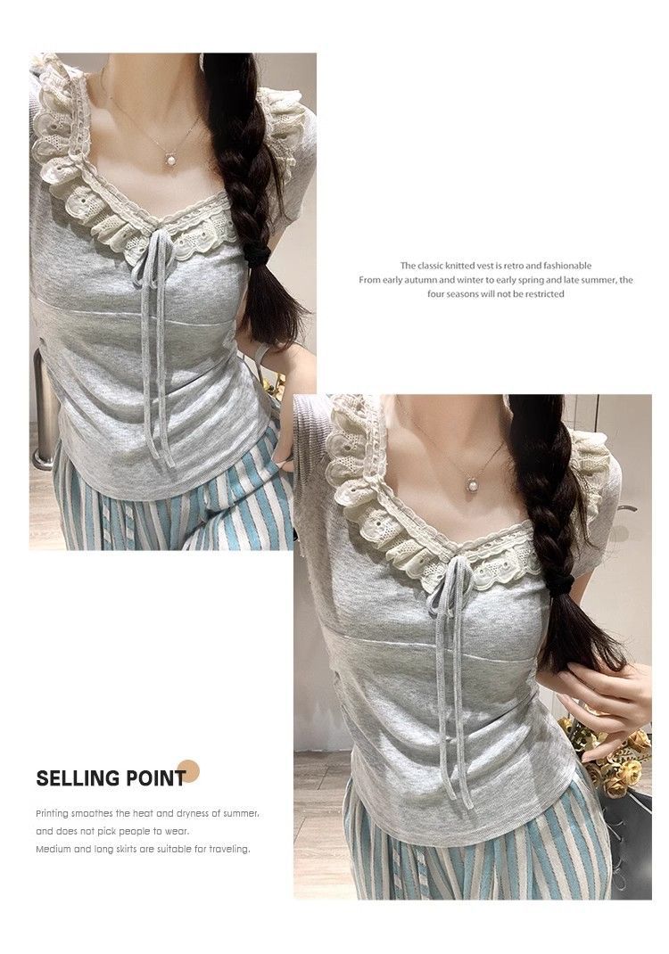 레이스 스티칭 레이스 반팔 티셔츠 여자 여름 2025 새로운 독특한 슈퍼 니스 플리츠 쇼트 탑