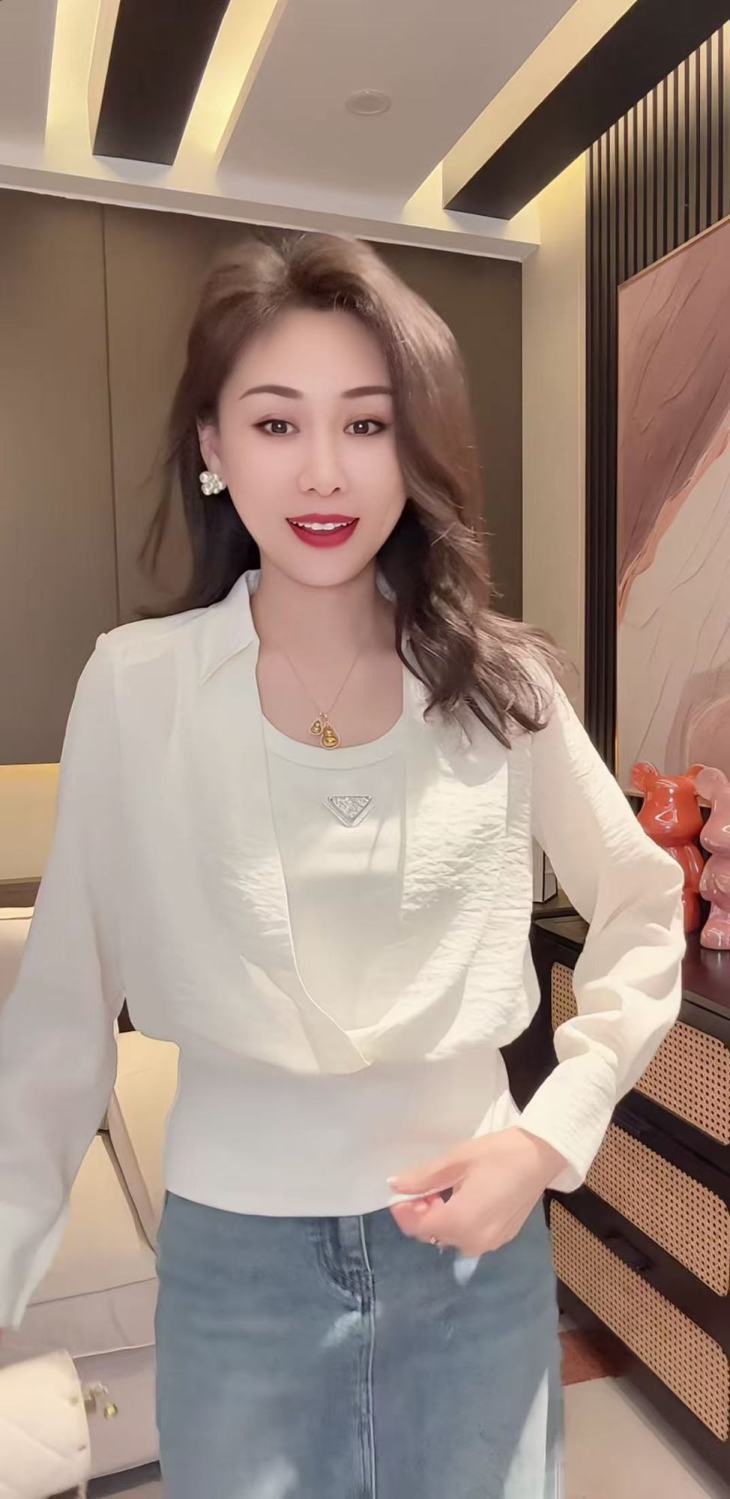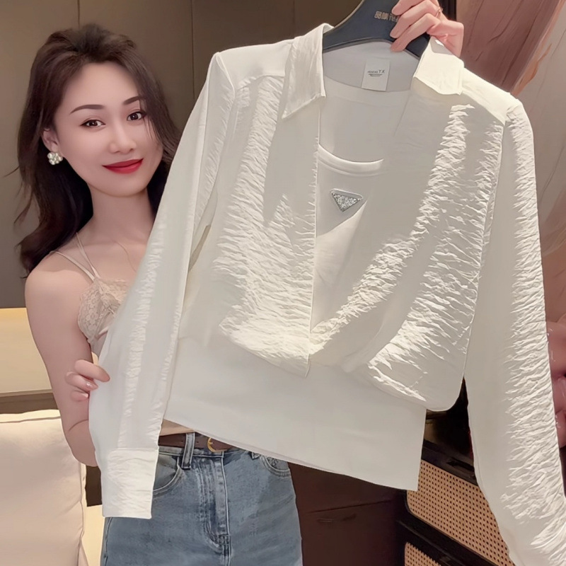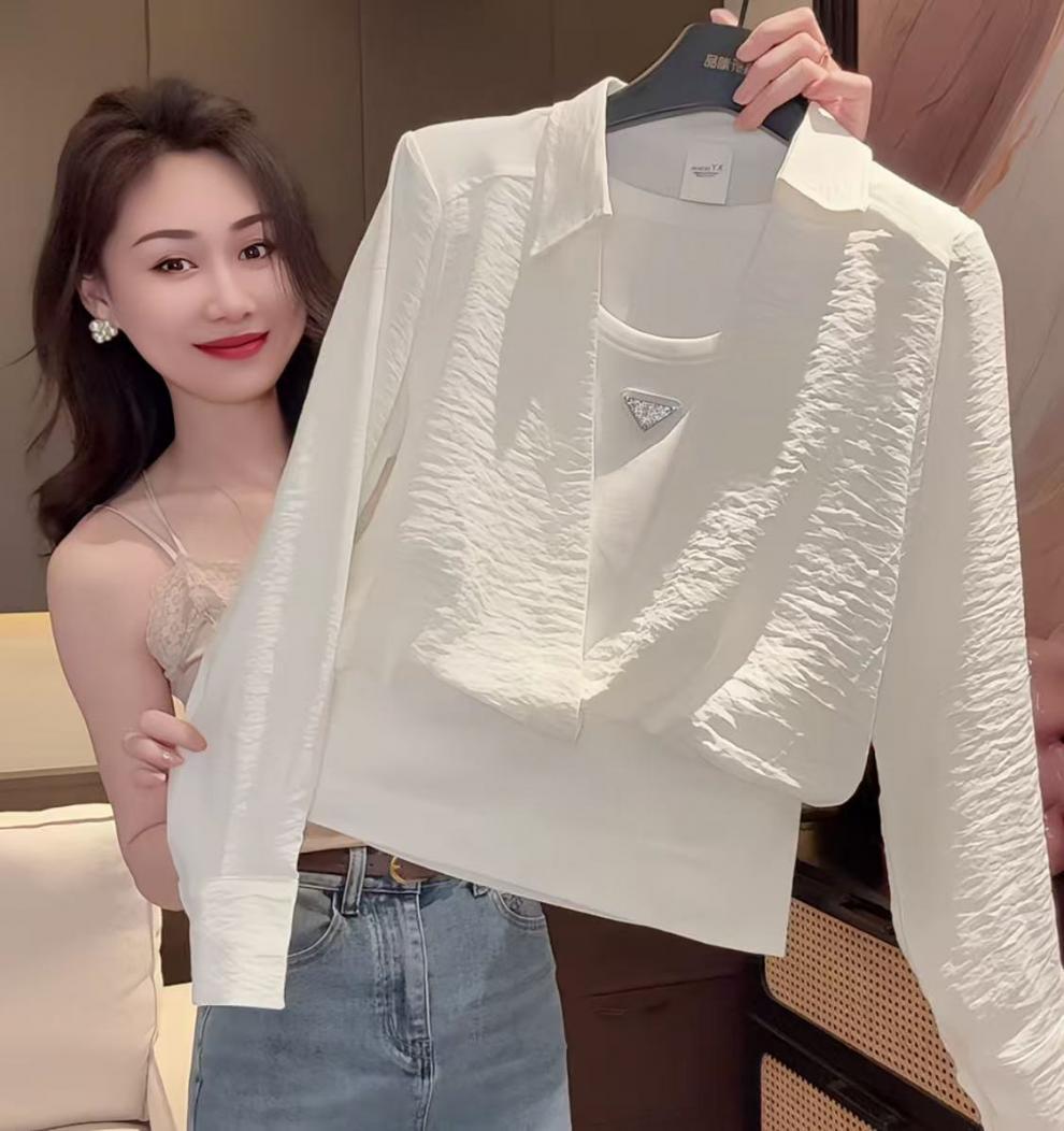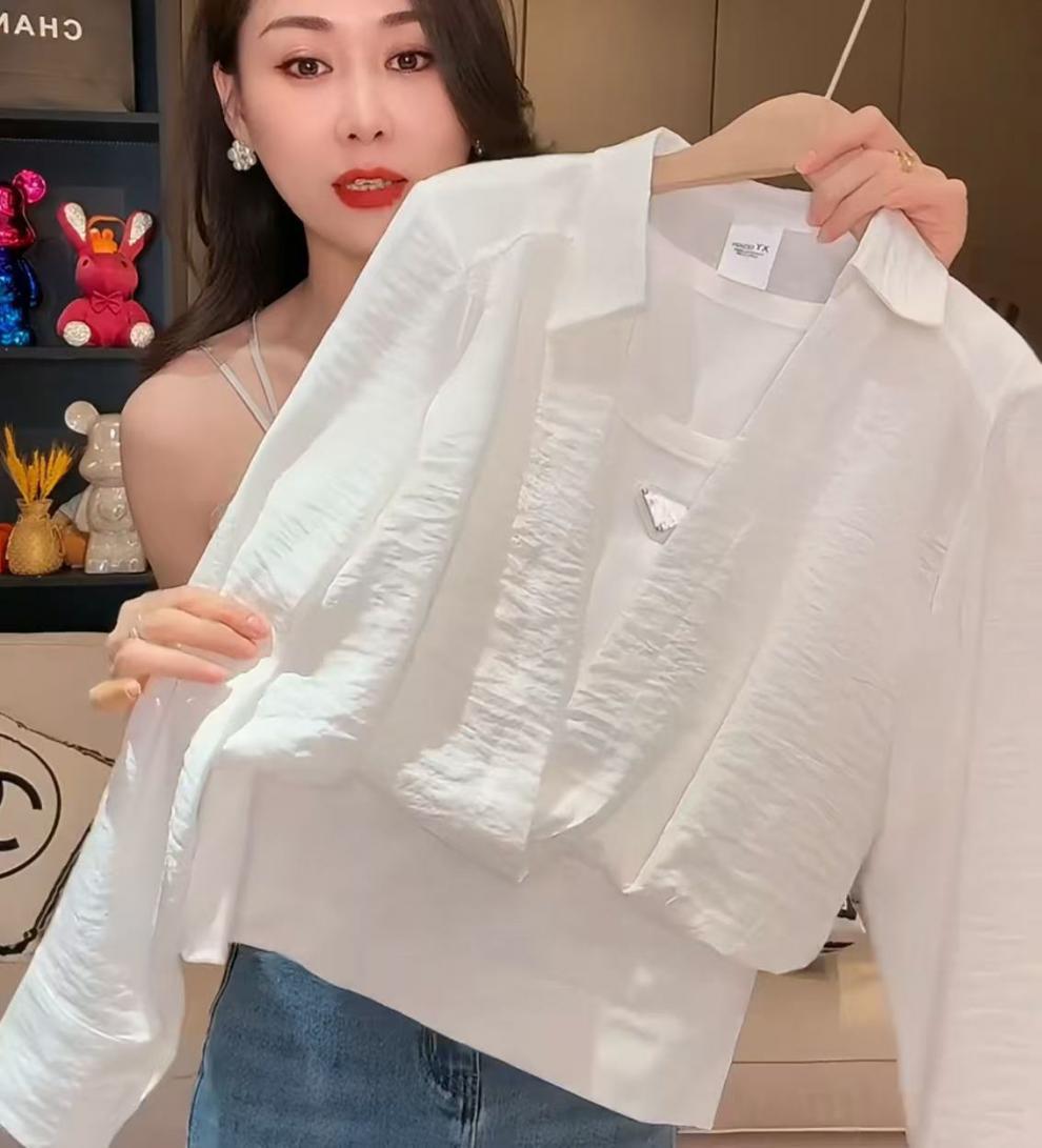 인터넷 연예인 2025 여름 새로운 가짜 투피스 디자인 긴팔 셔츠 여성의 우아한 태양 방지 느슨한 긴팔 고기로 덮인 탑스토어 가기