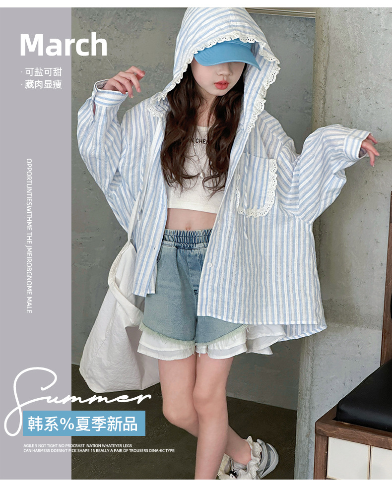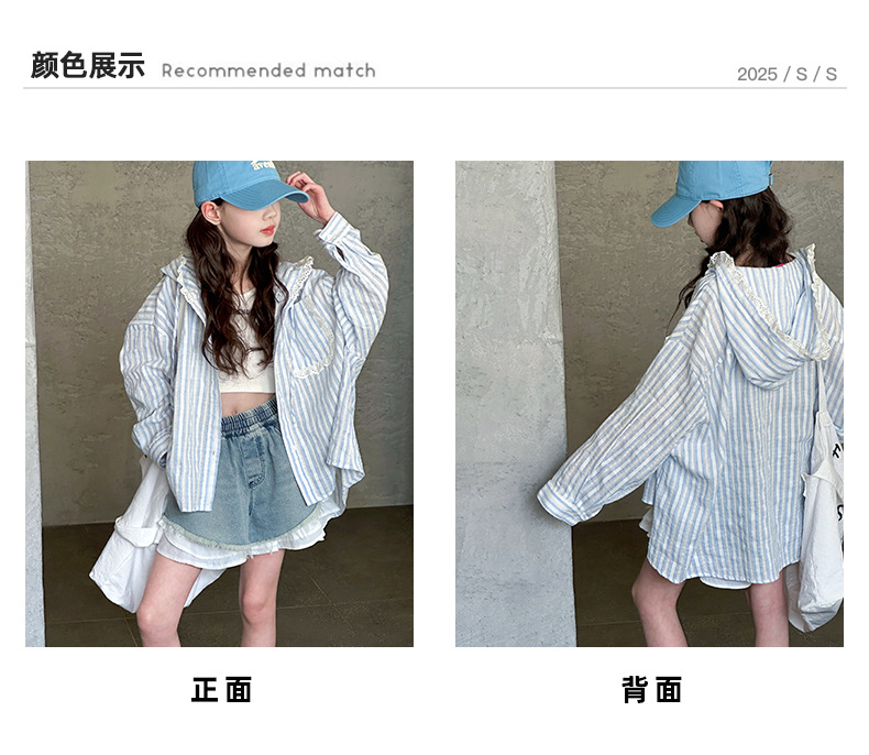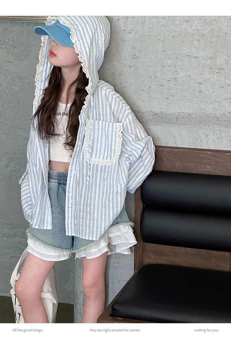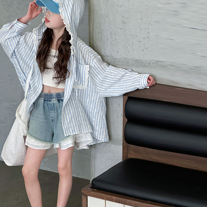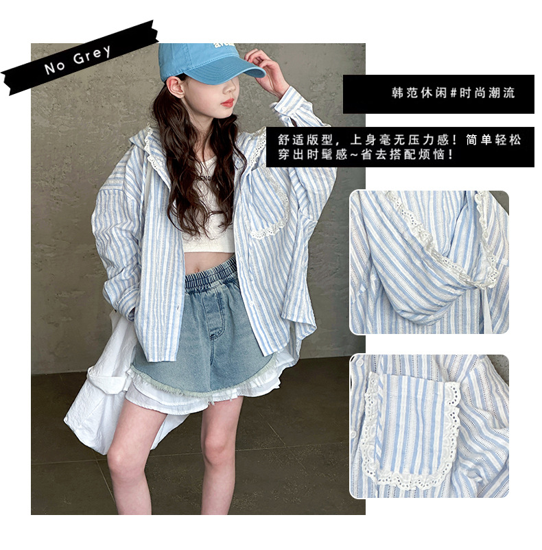 소녀의 셔츠 여름 2025 새로운 큰 키즈 셔츠 소녀의 세련된 유행 줄무늬 큰 키즈 선스크린 탑 후드스토어 가기