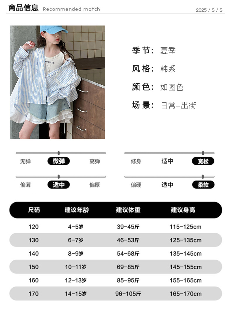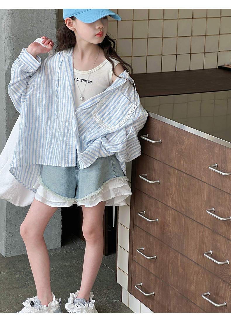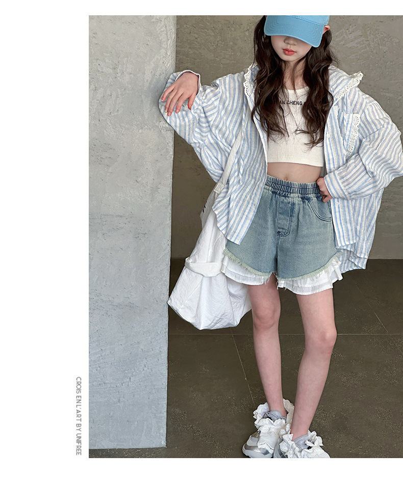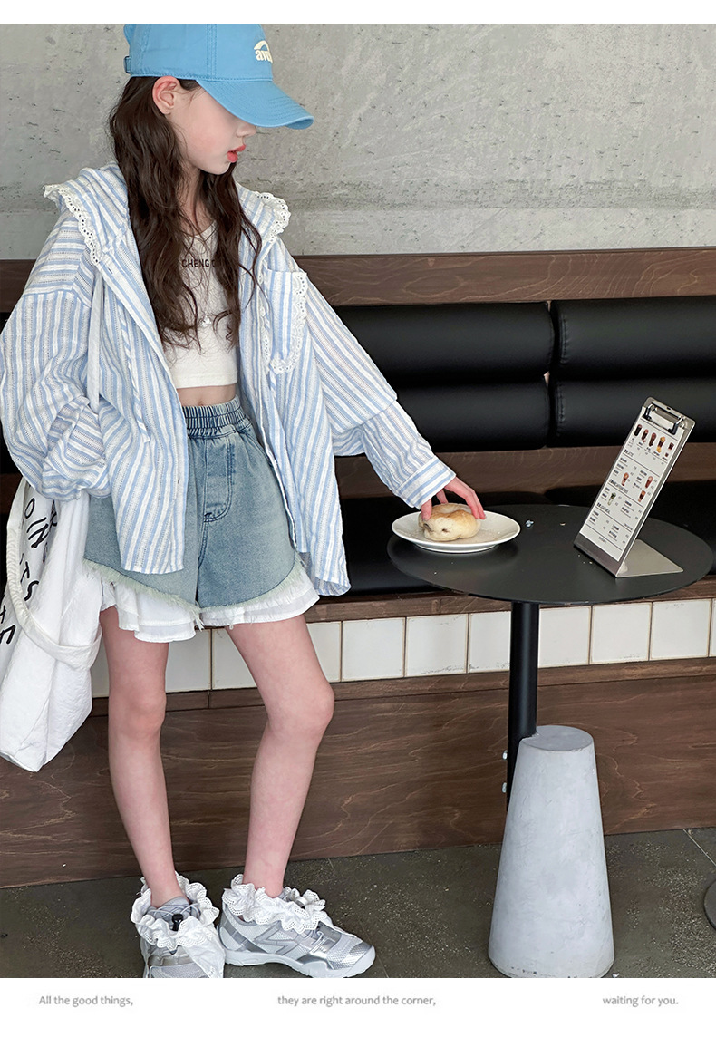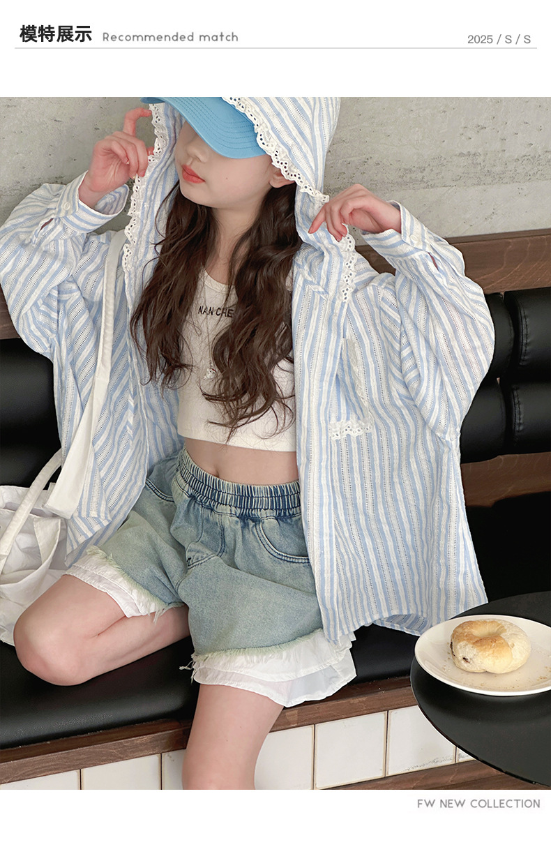 소녀의 셔츠 여름 2025 새로운 큰 키즈 셔츠 소녀의 세련된 유행 줄무늬 큰 키즈 선스크린 탑 후드스토어 가기