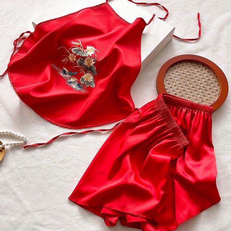여성용 자수 배꼽 스카프, 성인용 더블 레이어 모조 실크 속옷, 자수 복고풍 스타일 잠옷, 서스펜더 섹시 슈트