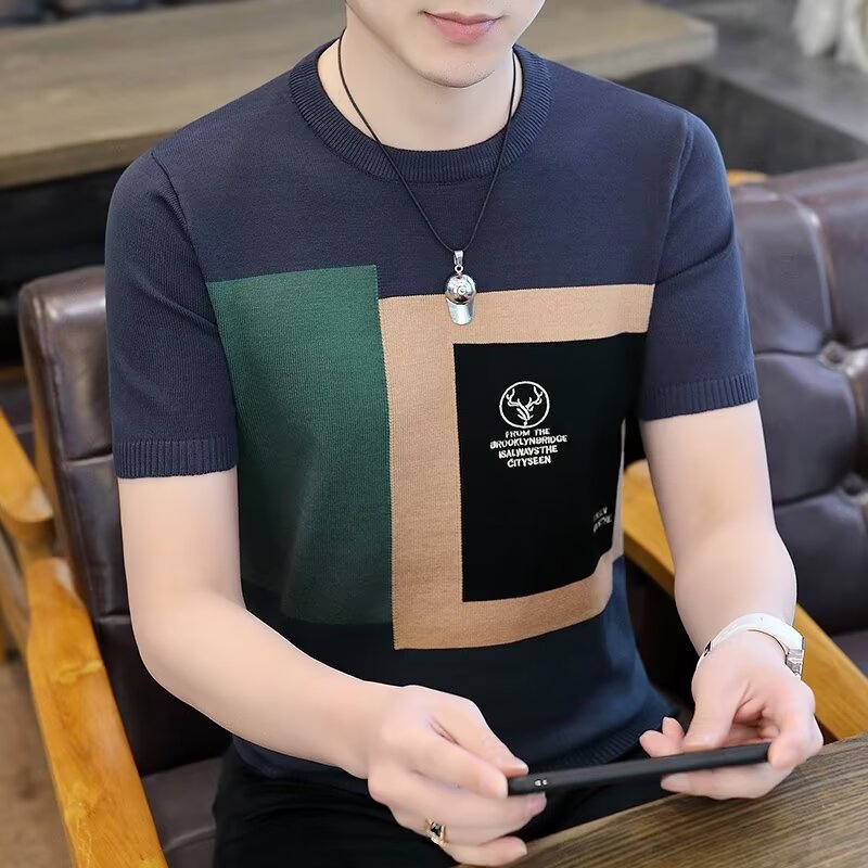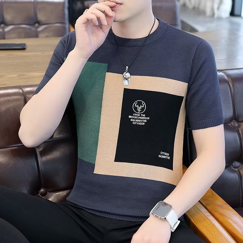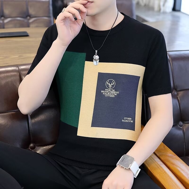 남자 니트 반팔 티셔츠 한국식 슬림핏 올매치 컬러 콘트라스트 아이스 실크 티셔츠 남자 반소매 컬러블록 캐주얼 탑 트렌디 티셔츠스토어 가기