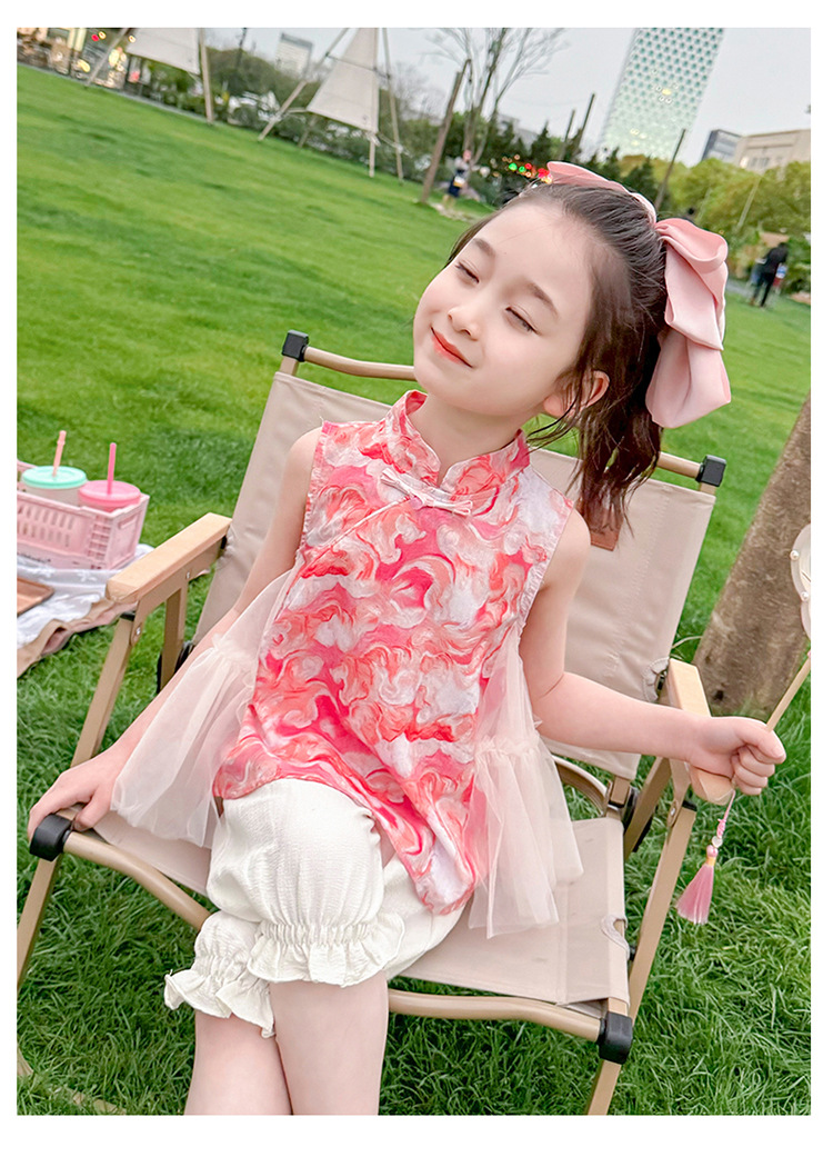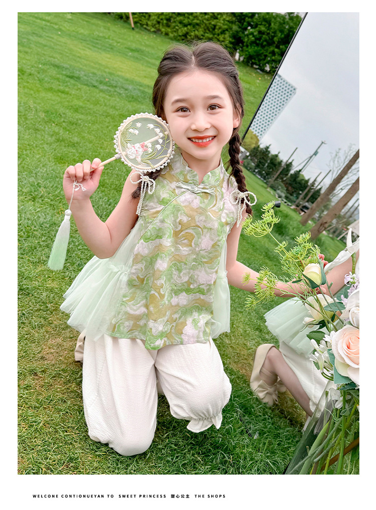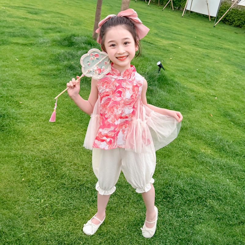 중국 스타일 여름 소녀의 달콤하고 세련된 민소매 양복 2024 새로운 아기 소녀의 새로운 중국 스타일 캐주얼 투피스 세트