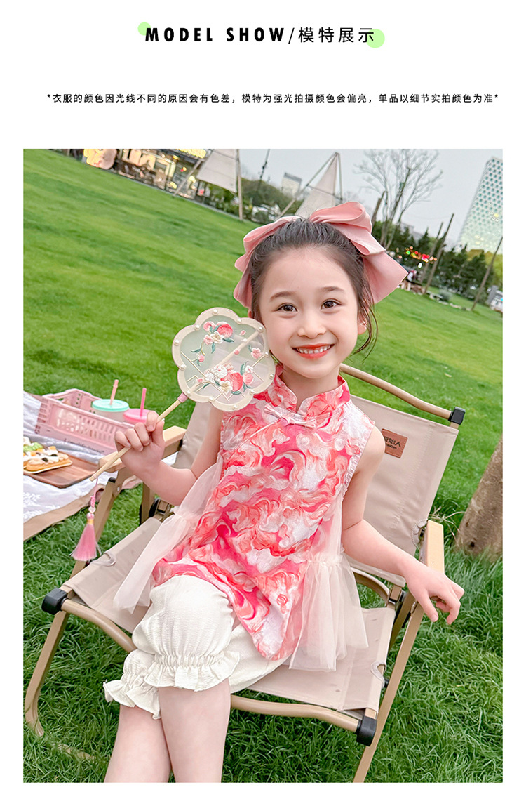 중국 스타일 여름 소녀의 달콤하고 세련된 민소매 양복 2024 새로운 아기 소녀의 새로운 중국 스타일 캐주얼 투피스 세트스토어 가기