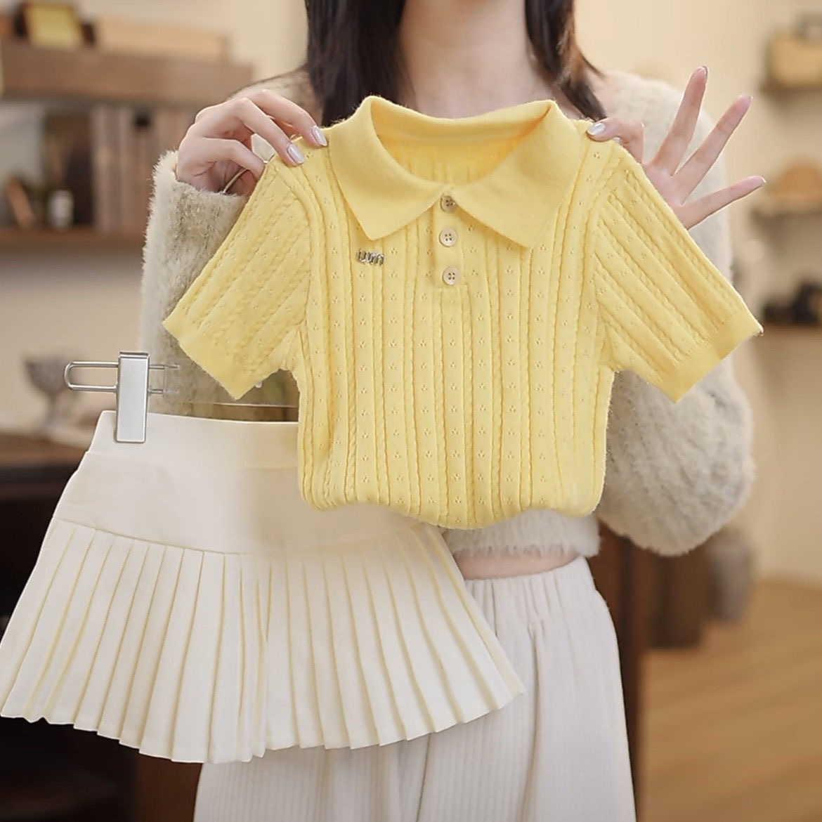 • 골든 니트 반팔 + 화이트 플리츠 스커트 [안전바지 포함]