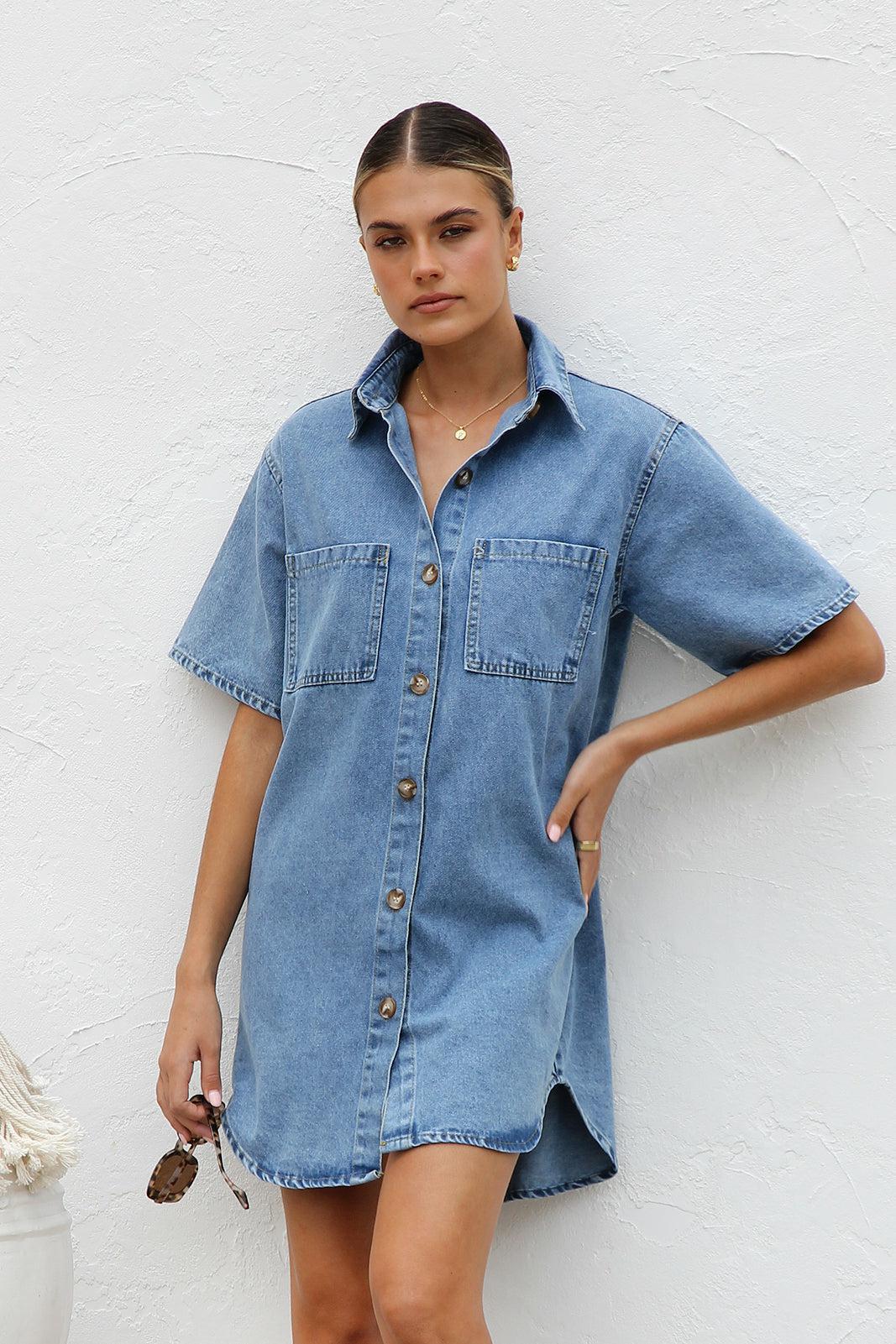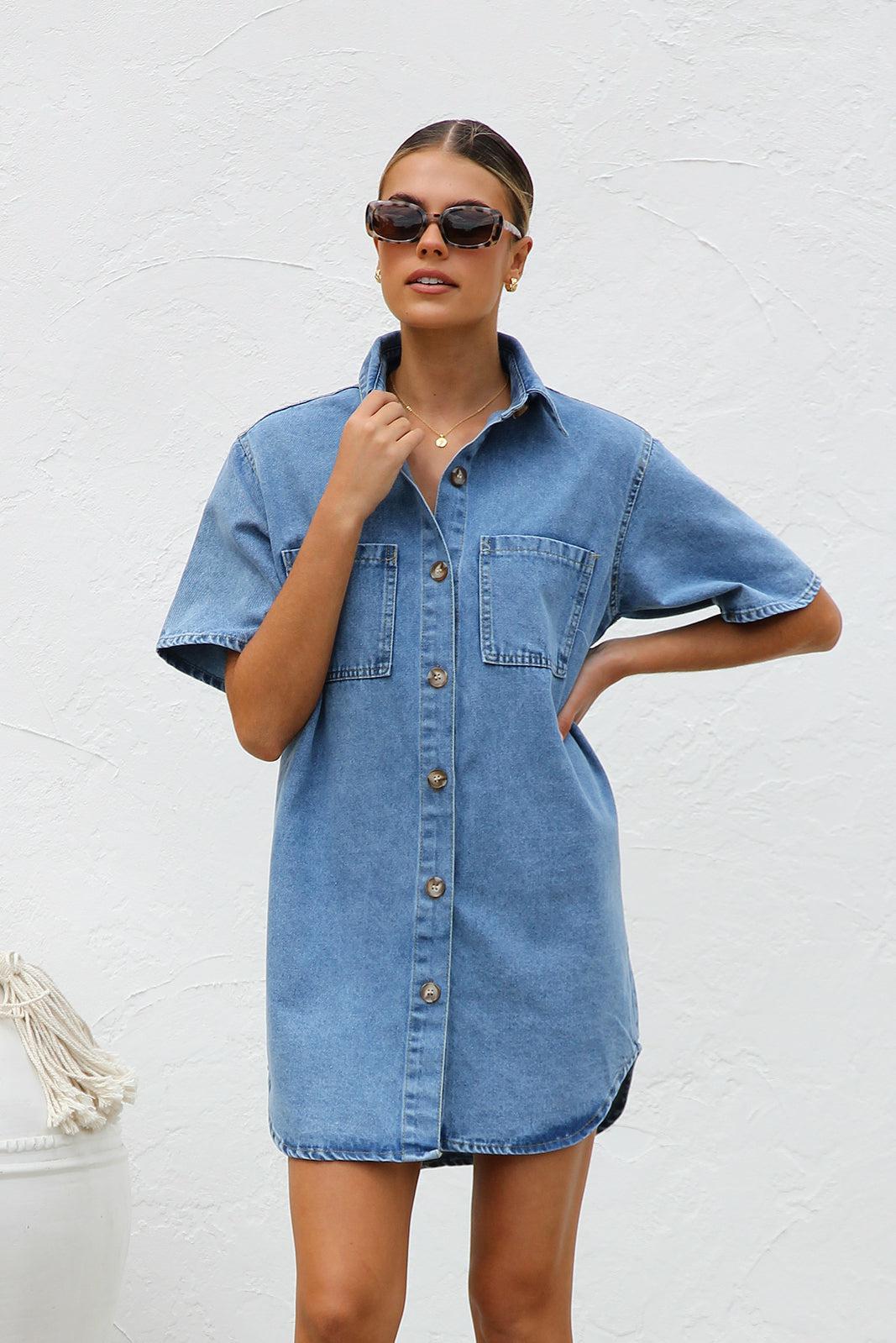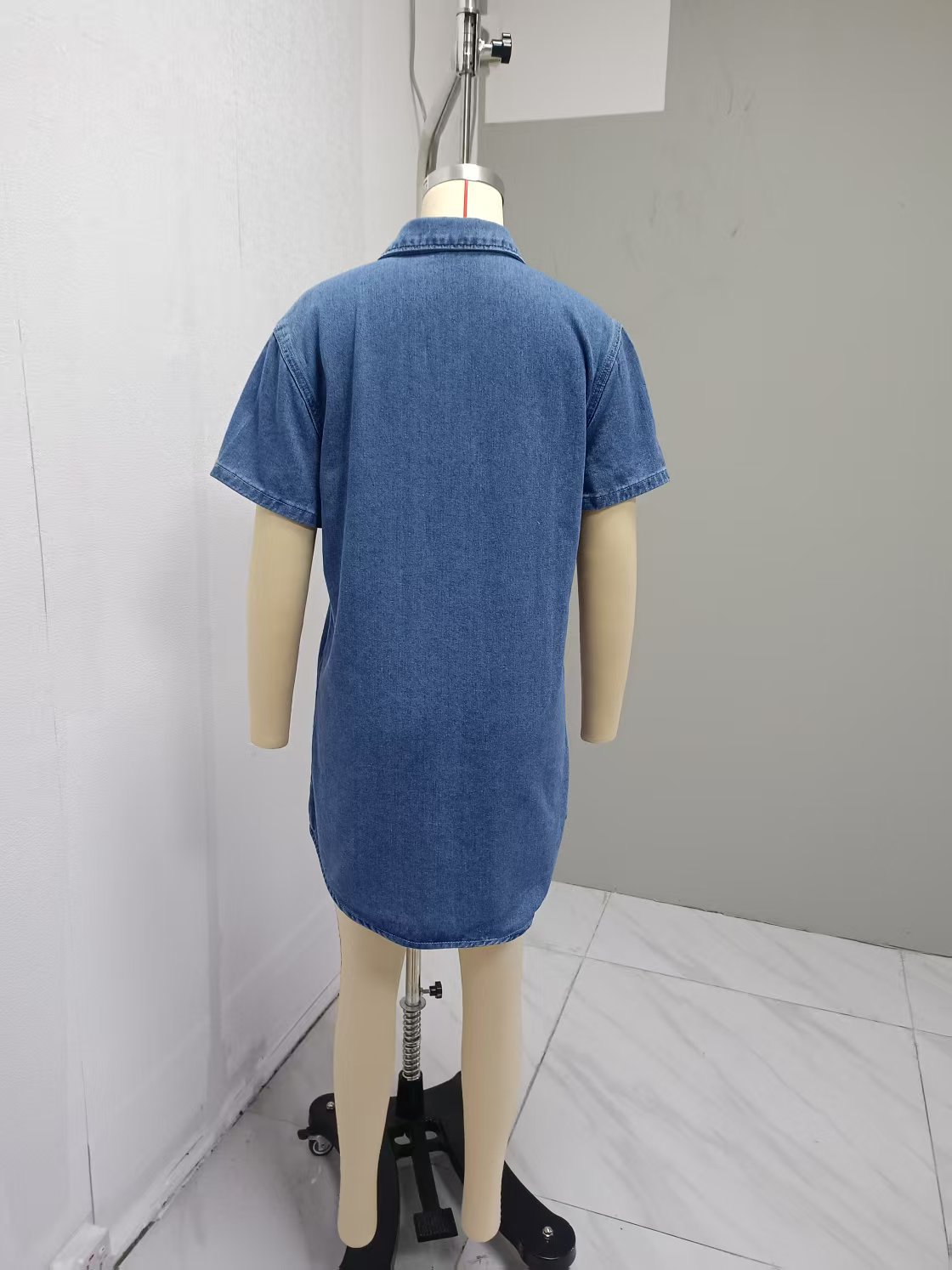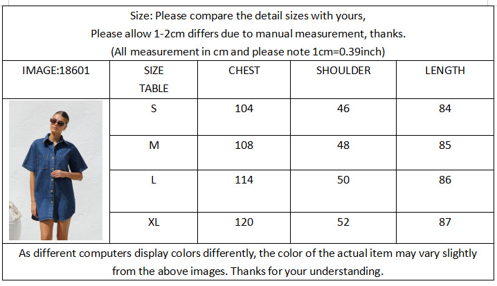 국경 대외 무역 여성 옷깃 데님 셔츠 드레스 여름 중간 길이 카디건 포켓 여성용 반팔 드레스스토어 가기