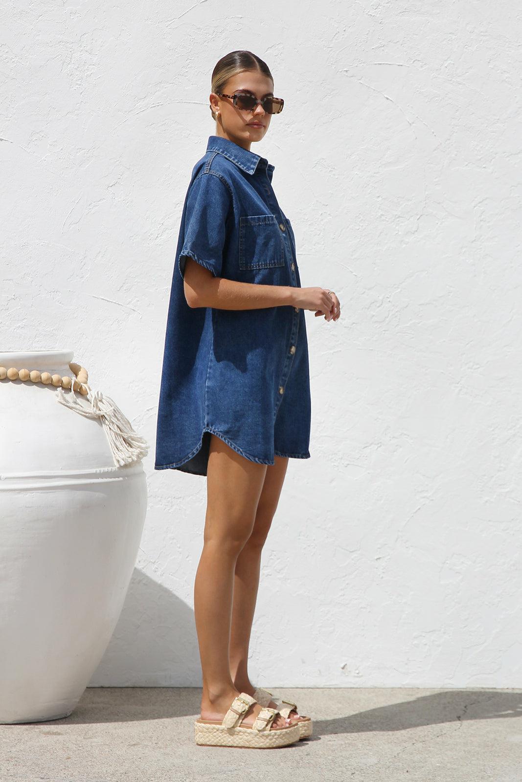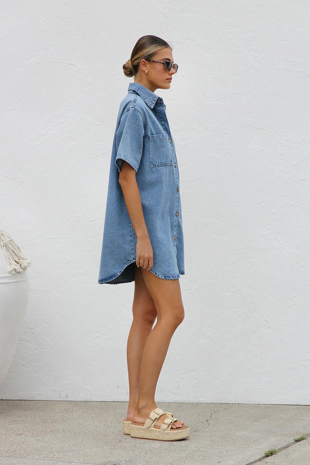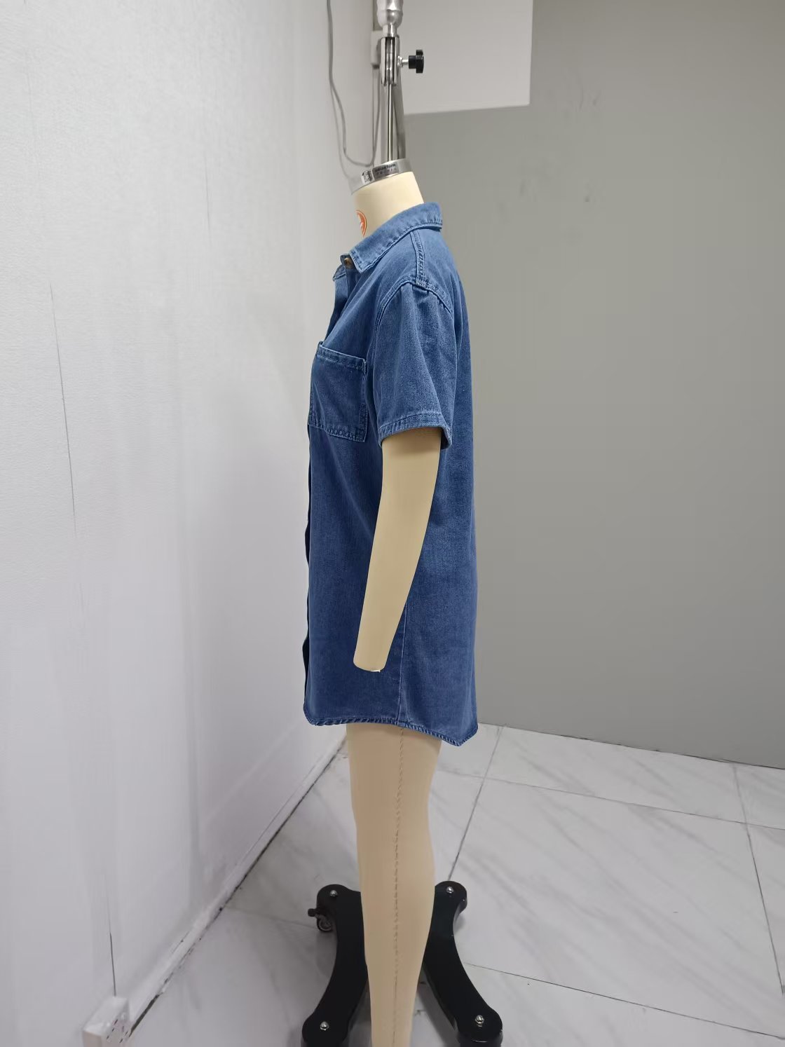 국경 대외 무역 여성 옷깃 데님 셔츠 드레스 여름 중간 길이 카디건 포켓 여성용 반팔 드레스스토어 가기