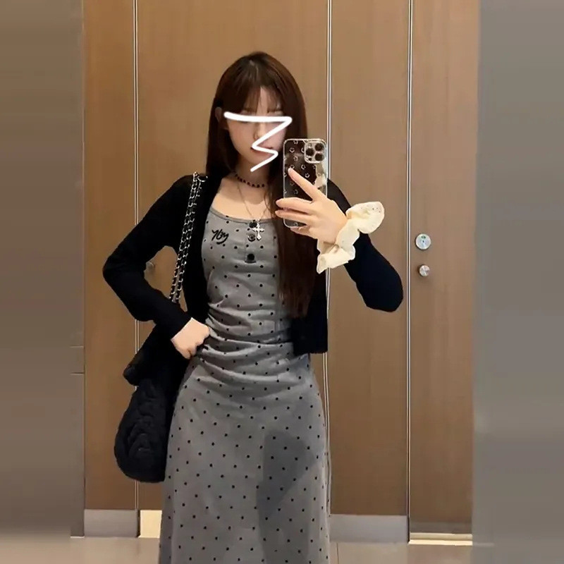 회색 웨이브 도트 슬링 원피스 여성 의류 여름 새로운 차 브레이크 프랑스 스타일 디자인 슬림 핏 엉덩이 긴 원피스 트렌디스토어 가기
