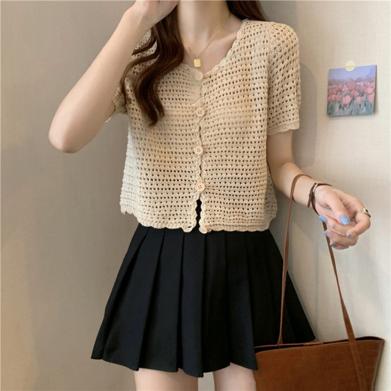 크로 셰 뜨개질 빈 아이스 실크 니트 카디건 여성용 얇은 프렌치 레트로 반팔 티셔츠 작은 짧은 독특한 탑
