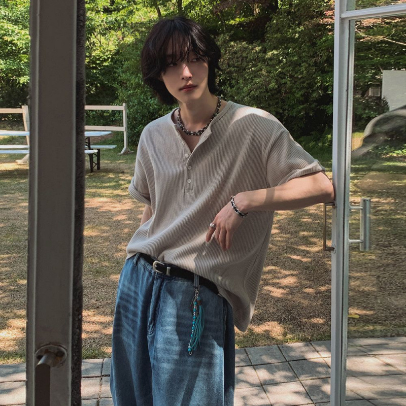 MYQ 헨리 칼라 반팔 티셔츠 남성 여름 루즈 캐주얼 반팔 티셔츠 한국 통근 올드 머니 스타일 트렌디웨어