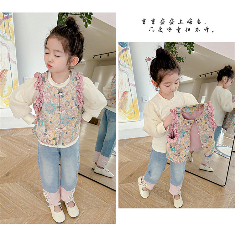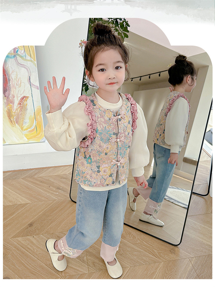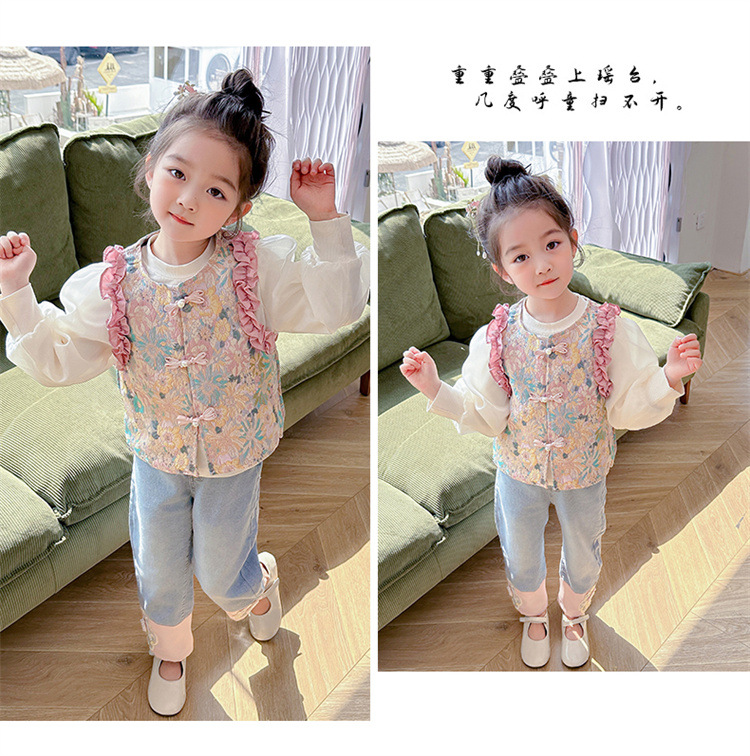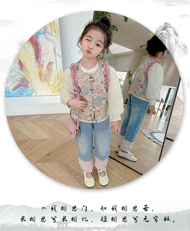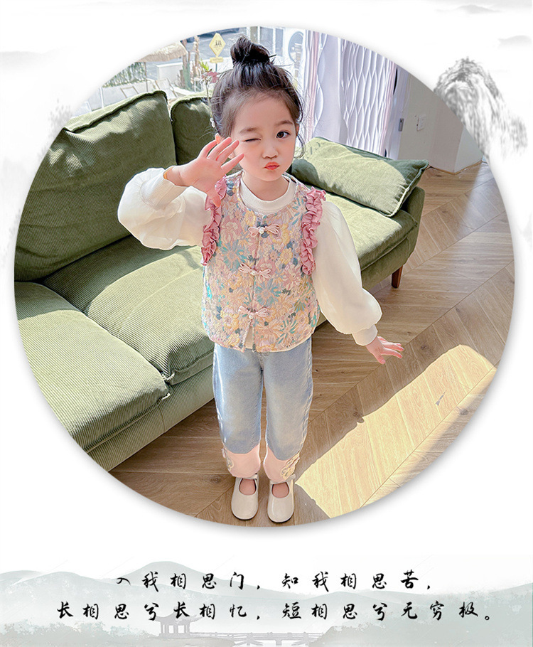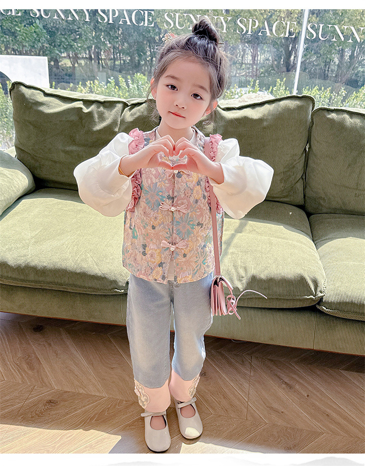 아동복 2025 봄, 가을 중국 스타일 서양식 아기 소녀 복고풍 스타일 소녀 조끼 3 피스 세트 Douyin 핫 스타일