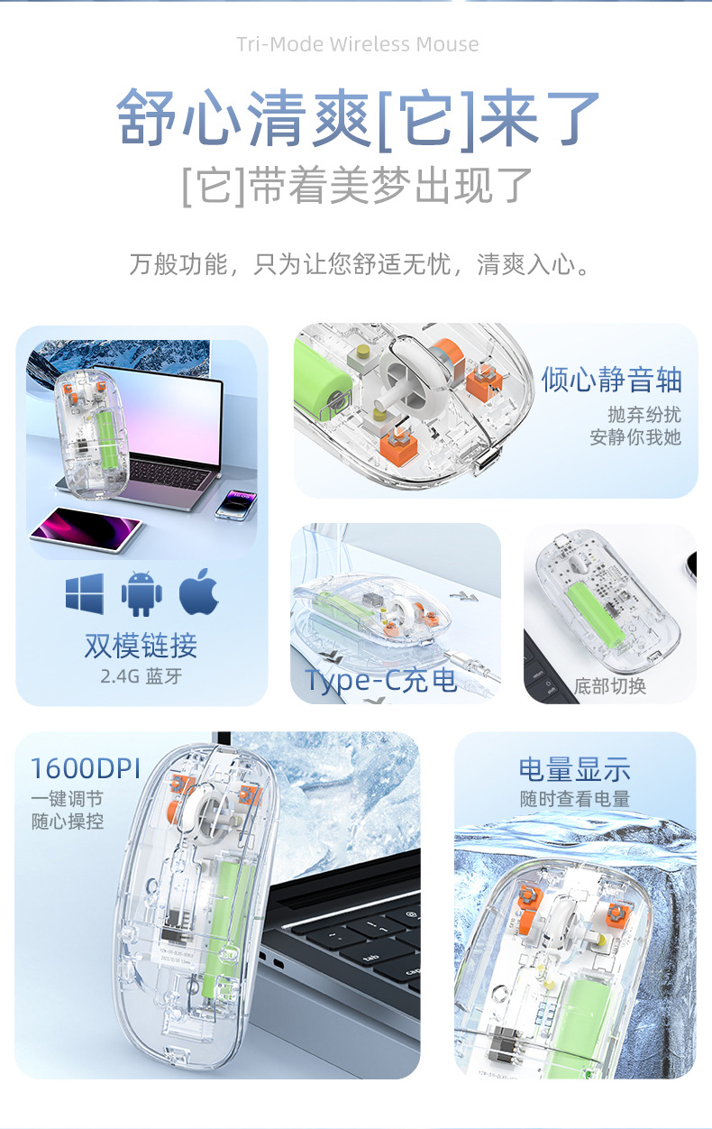 투명 마우스 무선 충전 디스플레이 전원 typec 충전식 자동 블루투스 듀얼 모드 사무용 마우스 공장