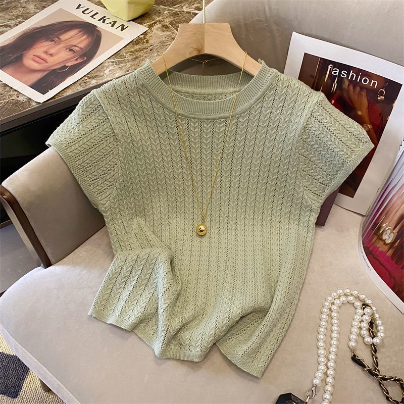 여성 니트 스웨터 짧은 플라잉 슬리브 2025 봄과 여름 새로운 라운드 넥 라이트급 쇼트베이스 디자인 솔리드 컬러 탑