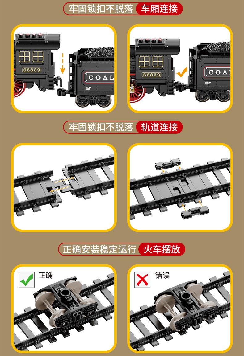 • 높은 구성 [전면 1개 + 석탄차 1개 + 식당차 1개 + 승용차 조명실 2개 + 곡선 레일 16개 + 직선 레일 6개 + 분기 레일 2개 + 잠금 장치 60개 + 신호등 2개 + 교량 1개]
