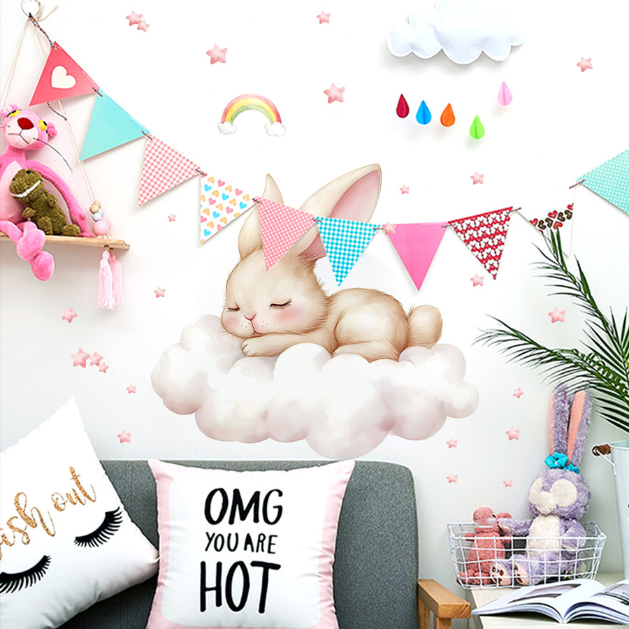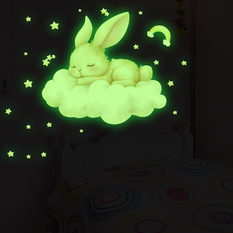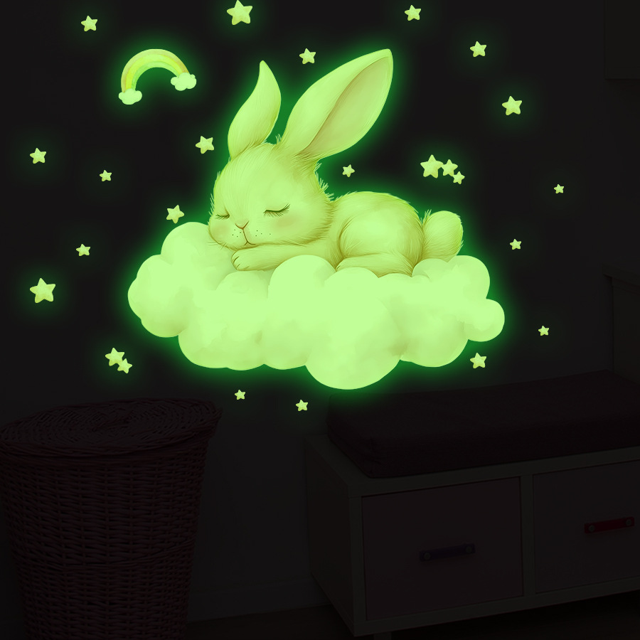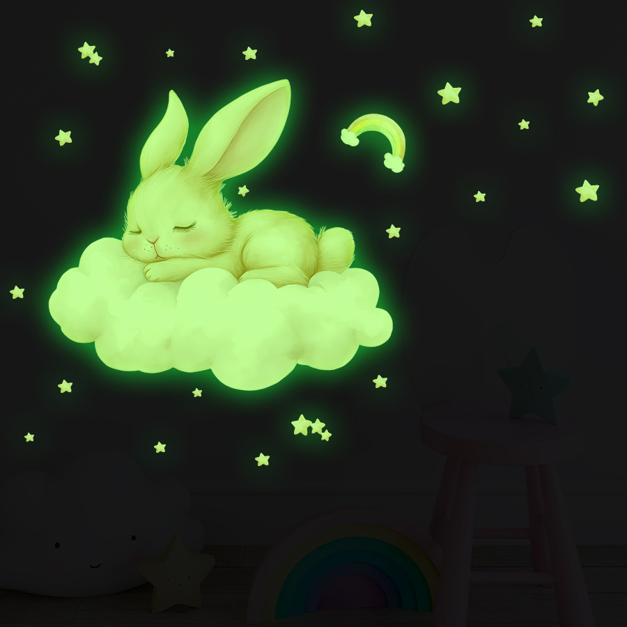 BR-YG036C 구름 잠자는 토끼 스타 만화 자기 접착 빛나는 벽 스티커 형광 녹색 침실 장식 스티커
