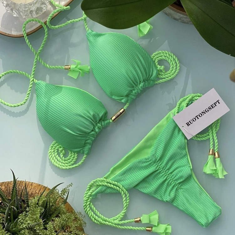 2025 유럽과 미국의 새로운 비키니 수영복 여성 솔리드 컬러 스플릿 드로스트링 보우 섹시한 비키니 스플릿 수영복스토어 가기