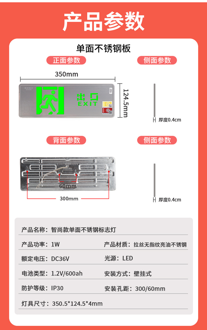 • Zhishang 스테인레스 스틸 사인 라이트 [단면 안전 출구] M6459