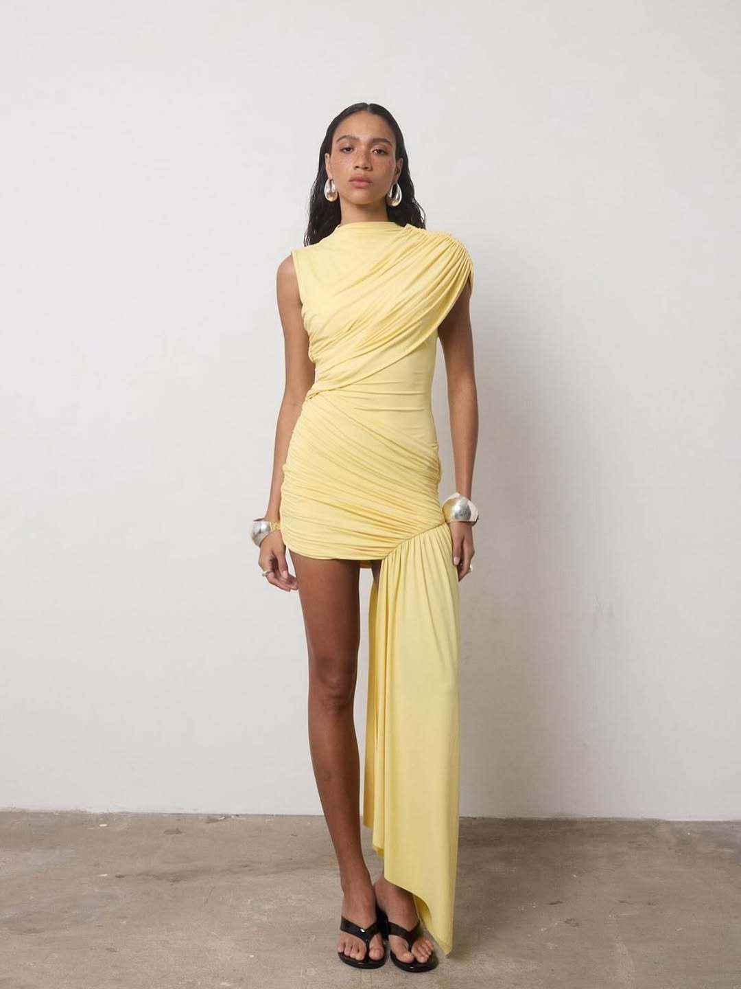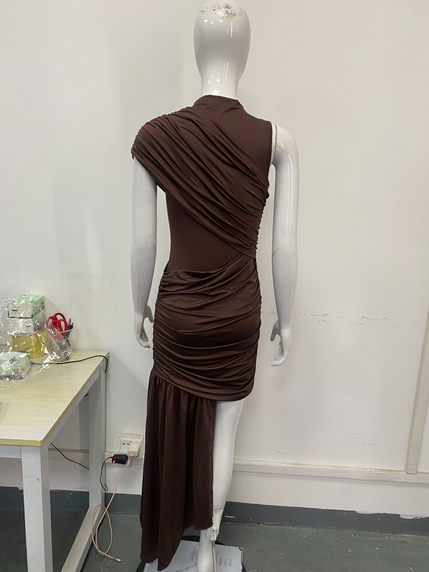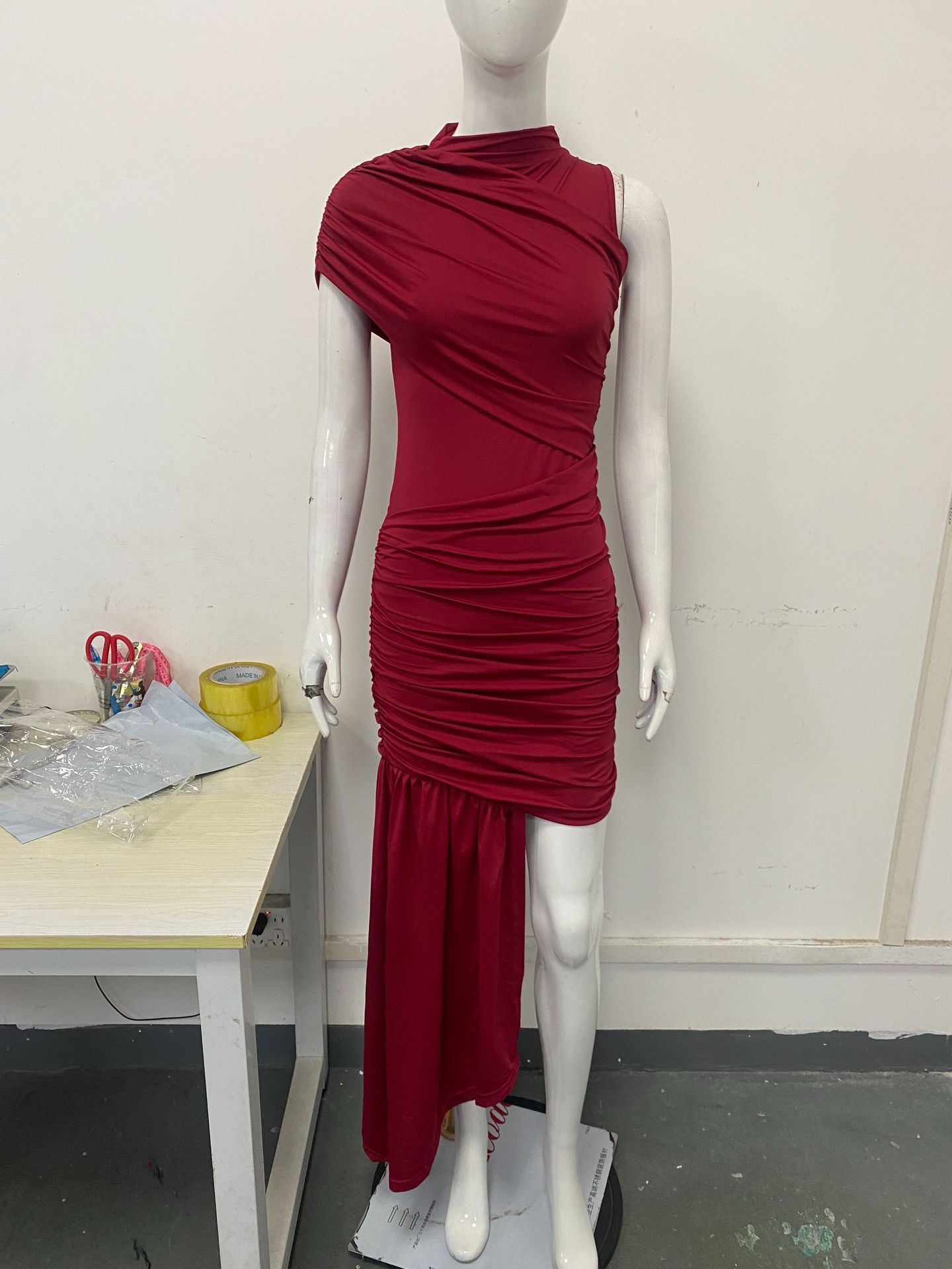 유럽과 미국 의류 2021 봄 여름 새로운 패션 슬림 라운드 넥 모여 엉덩이 불규칙한 민소매 드레스스토어 가기