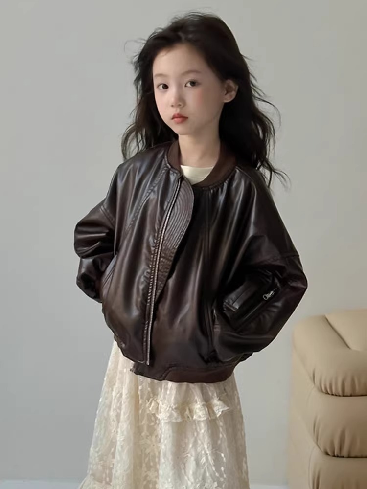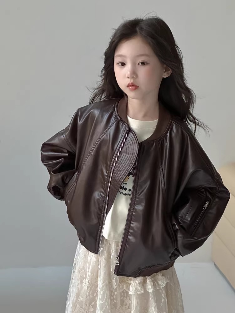 여아 코트 2024 봄 가을 새로운 스타일 유행 겉옷 짧은 가죽 코트 가을 의류 여성을위한 어린이 가을상의