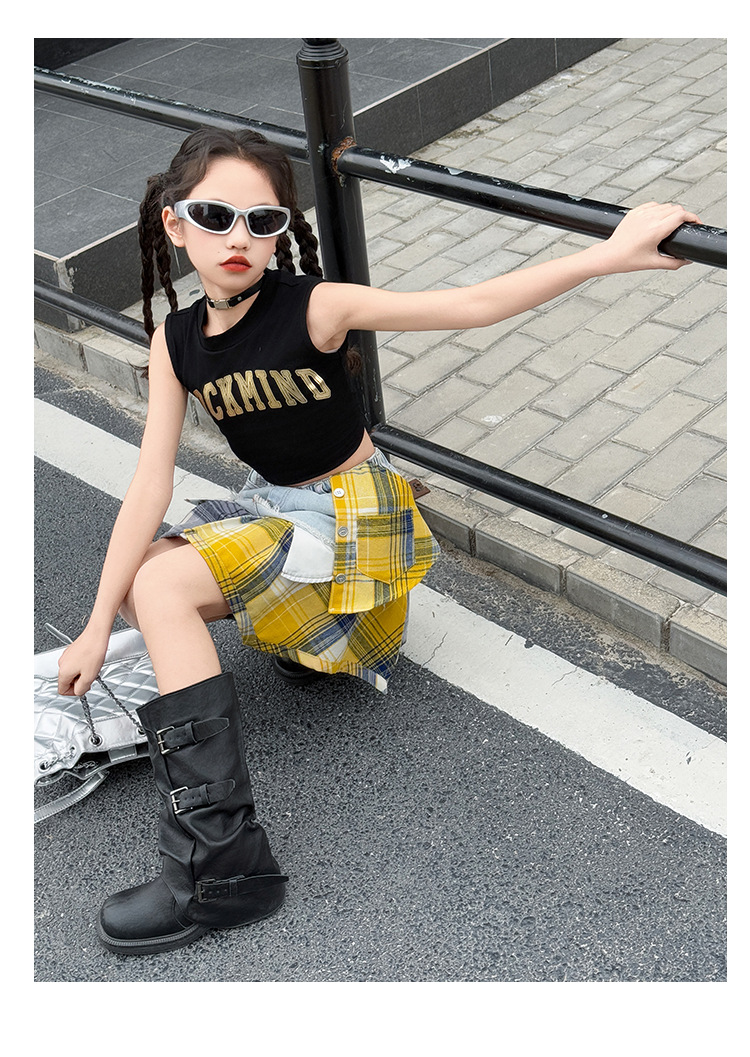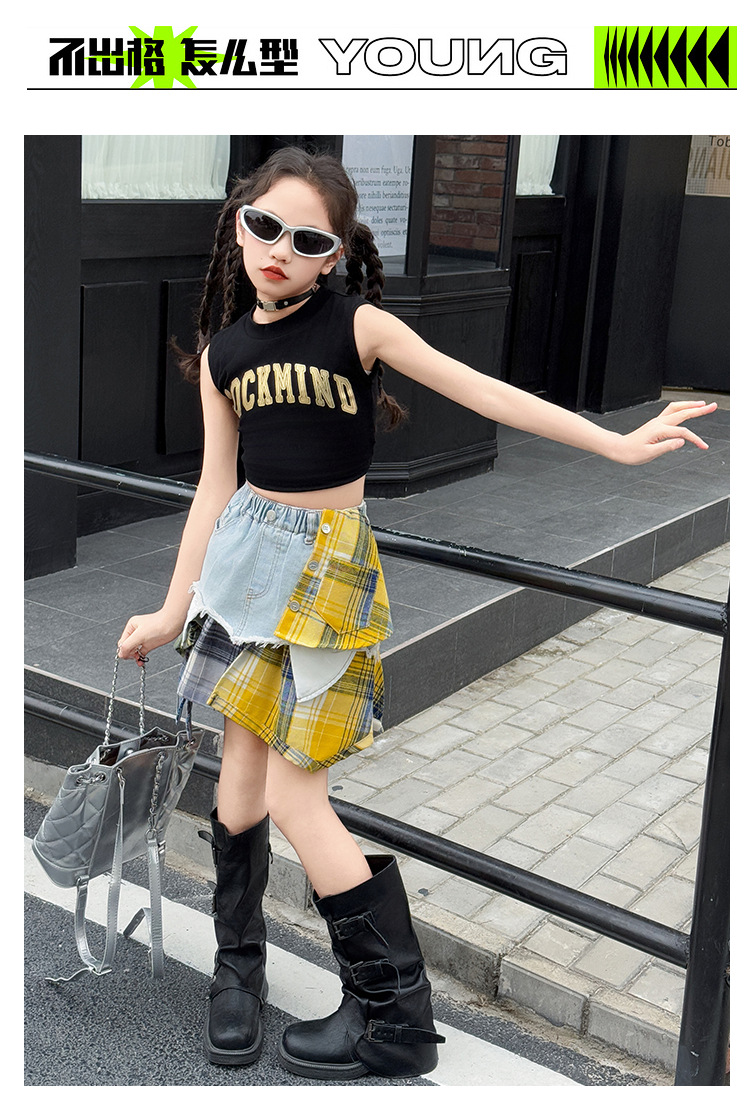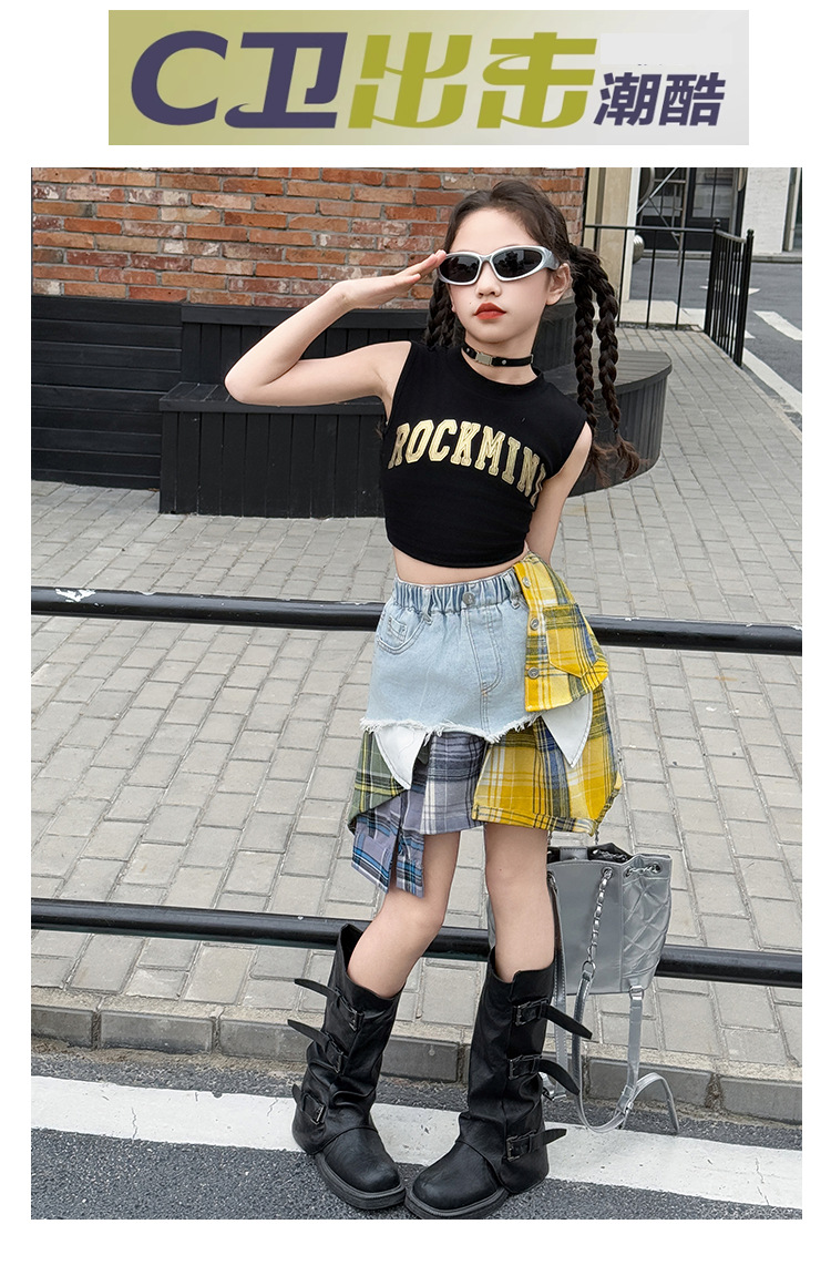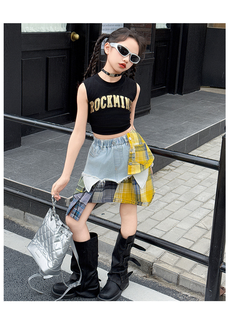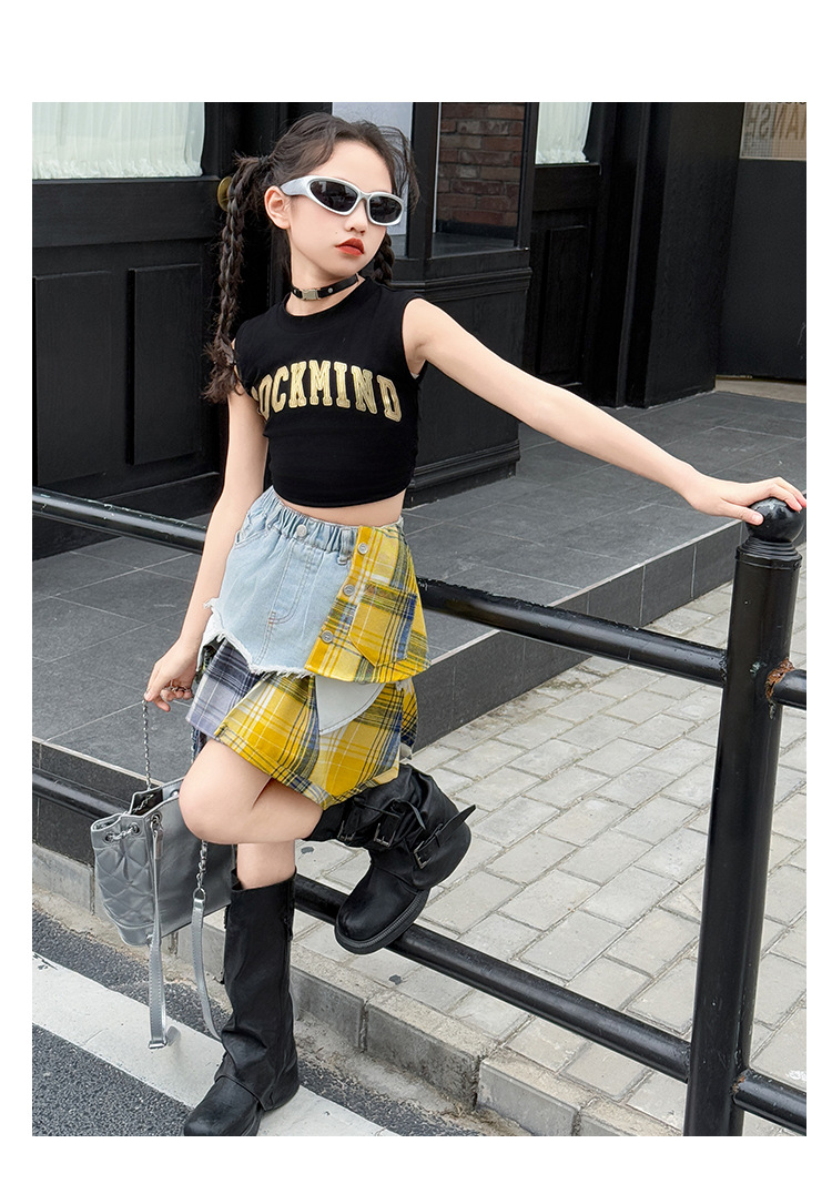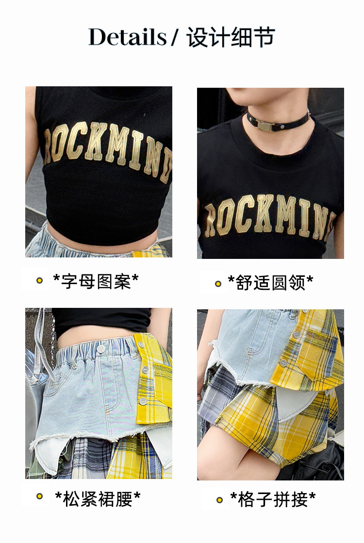 여자 여름 얇은 세트 2024 여름 새로운 반팔 티셔츠 탑 체크 무늬 스커트 투피스 세트