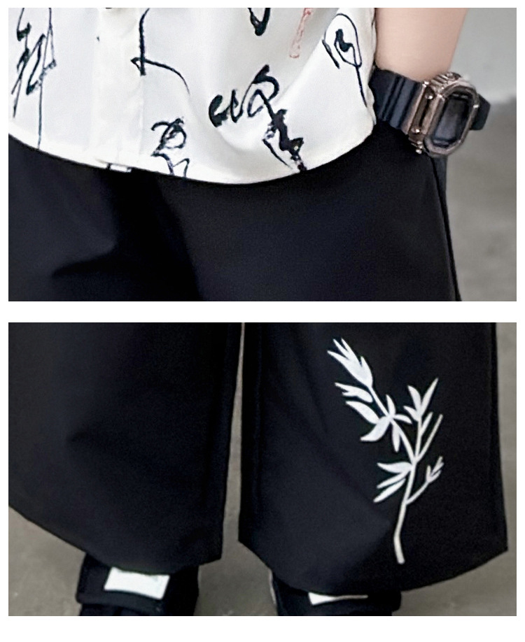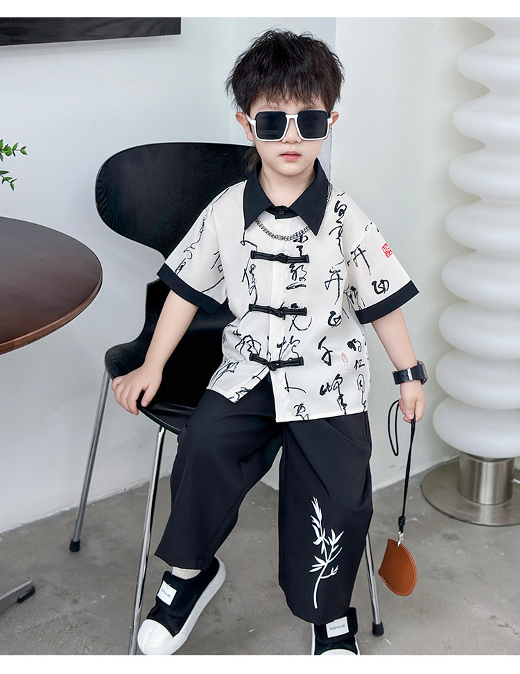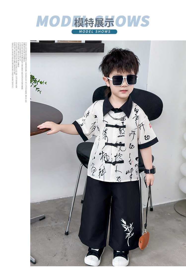 소년 여름 중국 스타일 Hanfu 셔츠 세트 25 새로운 어린이 고대 스타일 당나라 정장 반팔 와이드 레그 바지 투피스 세트