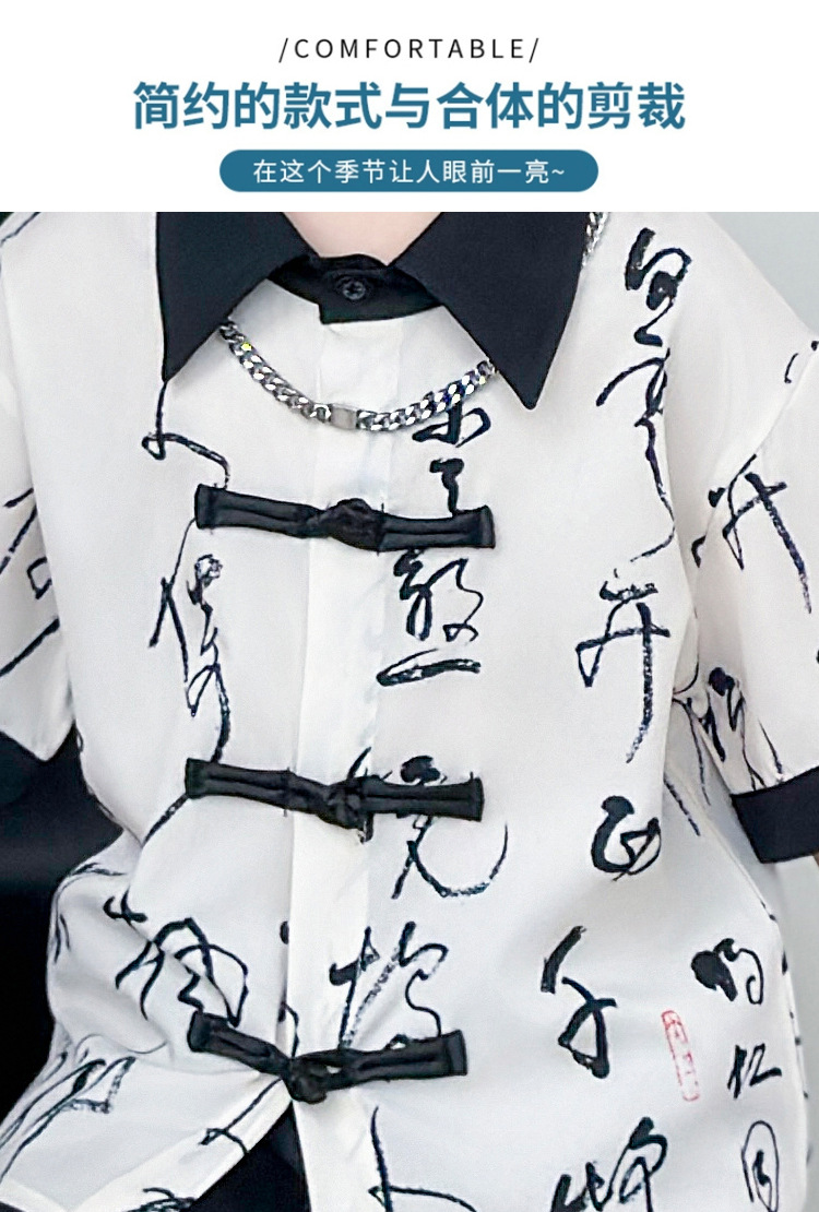 소년 여름 중국 스타일 Hanfu 셔츠 세트 25 새로운 어린이 고대 스타일 당나라 정장 반팔 와이드 레그 바지 투피스 세트스토어 가기