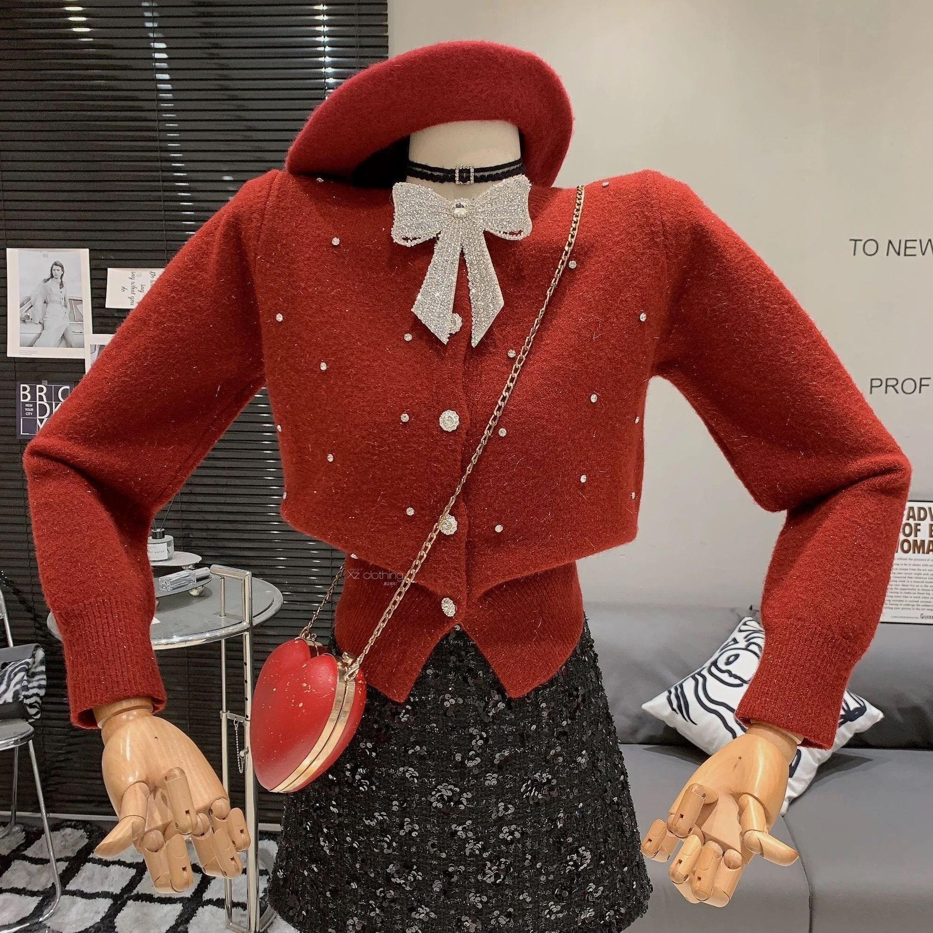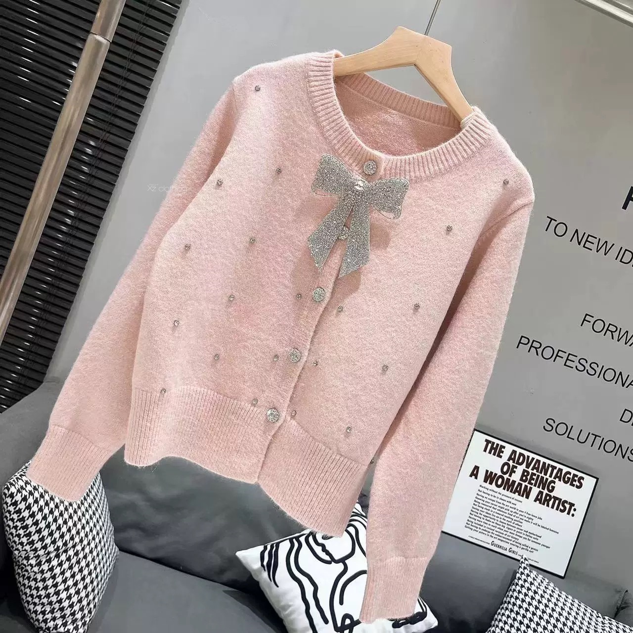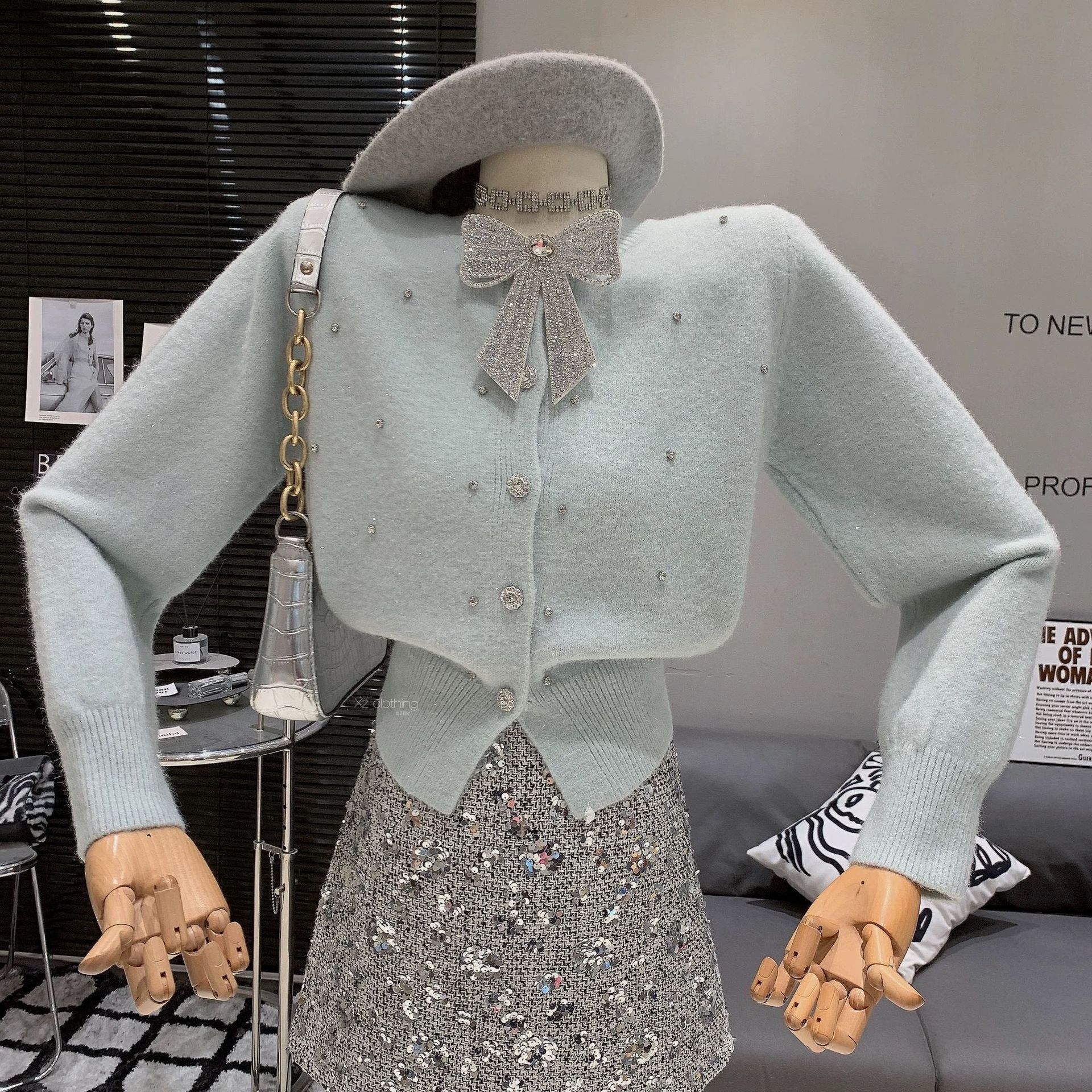 한국 스타일 우아한 부드러운 스타일 중공업 구슬 활 디자인 센스 슬림 핏 슬리밍 라운드 넥 싱글 가슴 니트 카디건스토어 가기