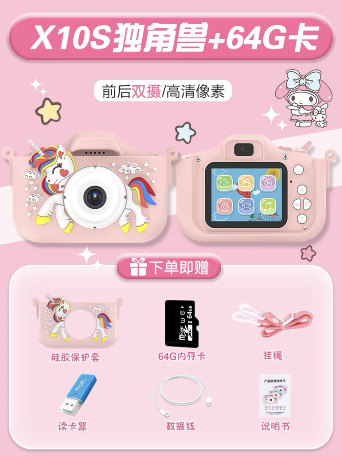 • (핑크 유니콘) 플래그십 HD 듀얼 카메라 + 64G 메모리 카드 패키지