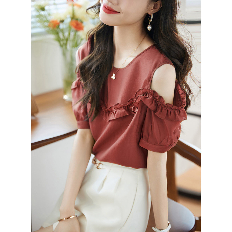 2025 여름 새로운 라운드 넥 숄더 쉬폰 얇은 통기성 편안한 솔리드 컬러 올 매치 여성용 셔츠 패션 웨스턴 스타일스토어 가기