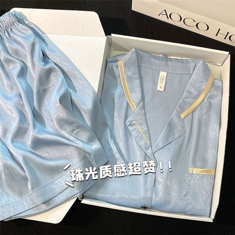 Ins 하이 엔드 파자마 여성용 여름 아이스 실크 반팔 반바지 간단한 실크 홈 의류 여름 세트 아우터웨어스토어 가기