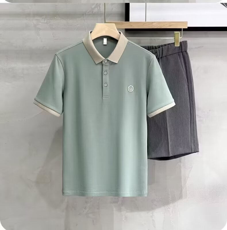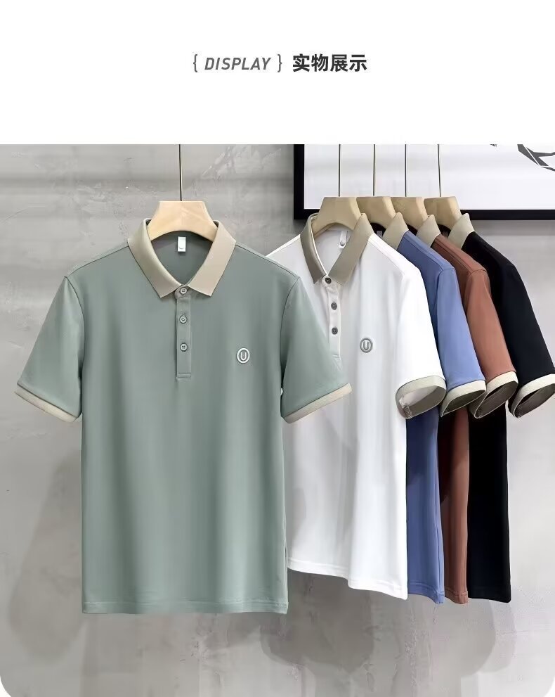 여름 새 반소매 폴로 셔츠 아이스 실크 대외 무역 폴 셔츠 골드 라인 대비 컬러 럭 남자 반소매 티셔츠