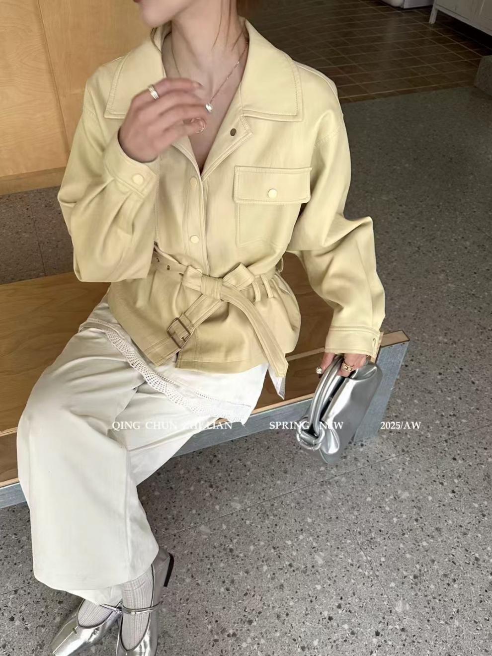 빈티지 PU 가죽 옷깃 달콤한 쿨 스타일 타이트 허리 짧은 가죽 자켓 여성의 2025 봄 새로운 패션 재킷 바이커 탑스토어 가기