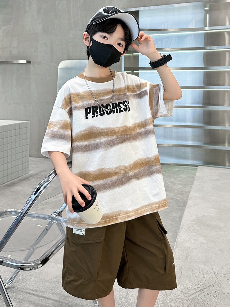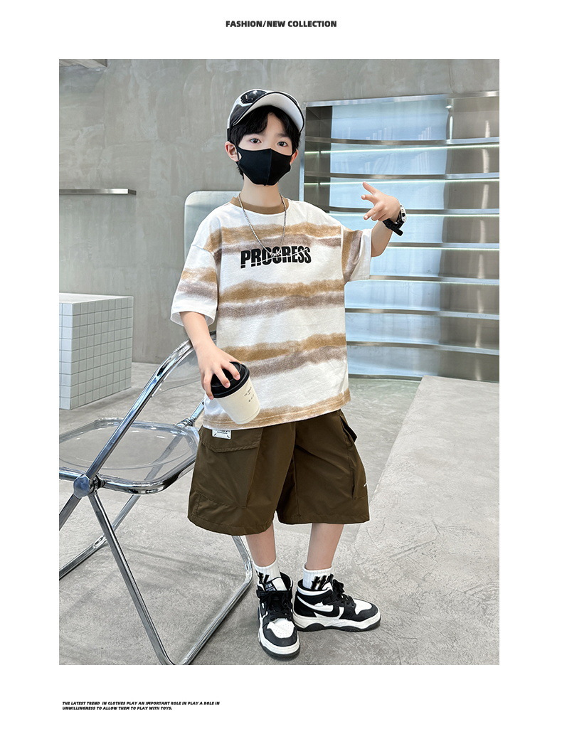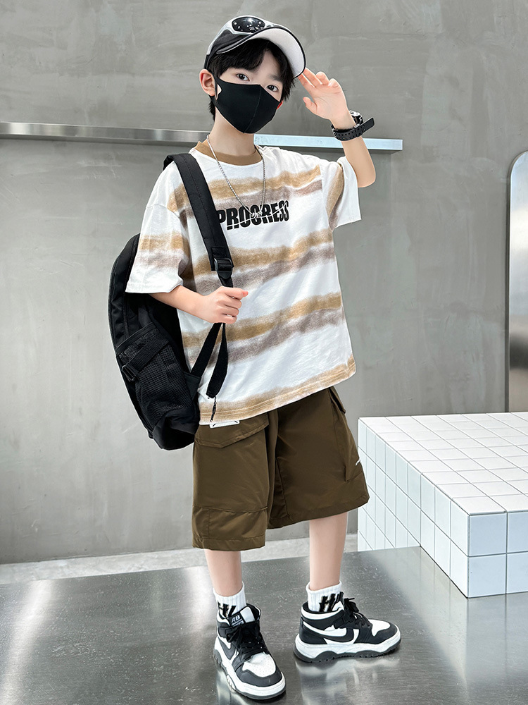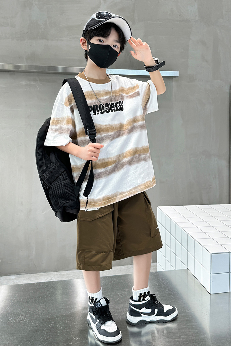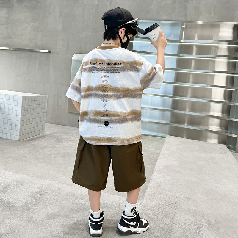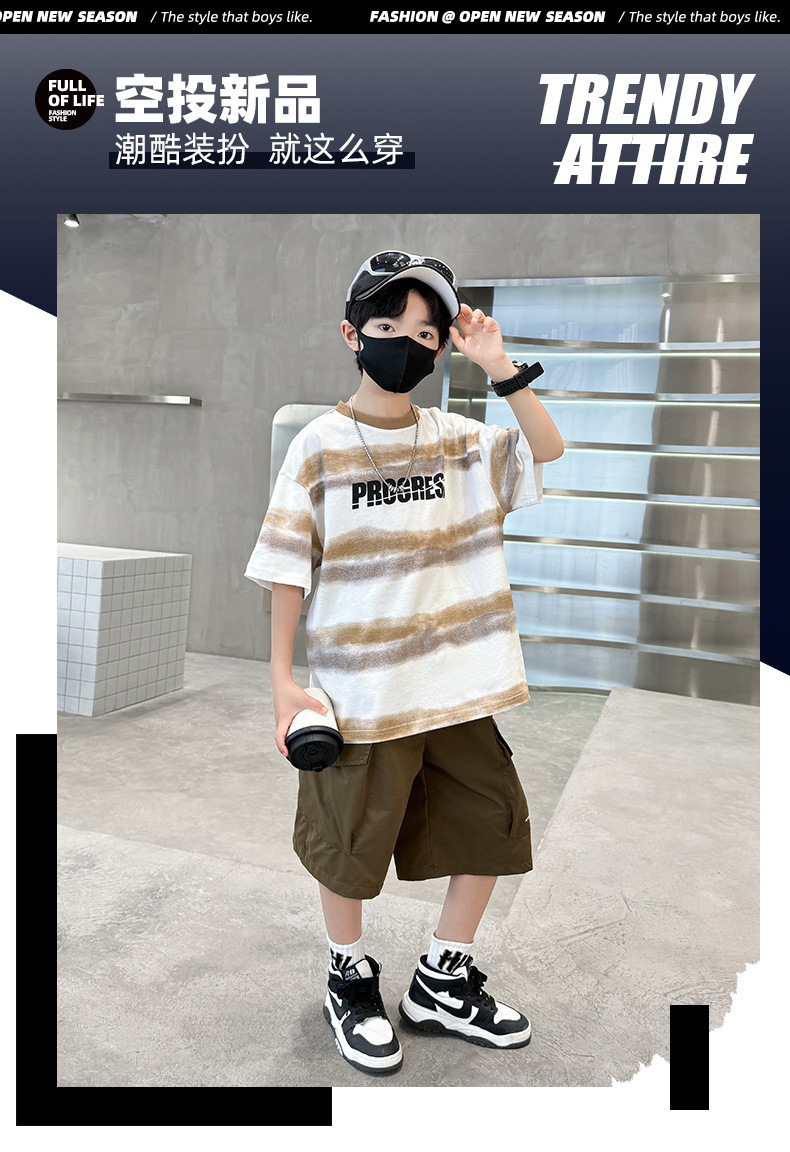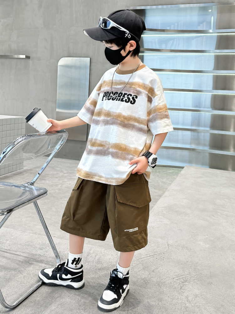 남학생 여름복 줄무늬 편지 반팔 티셔츠 세트 2025 새로운 중대형 어린이 여름 바지 투피스 세트