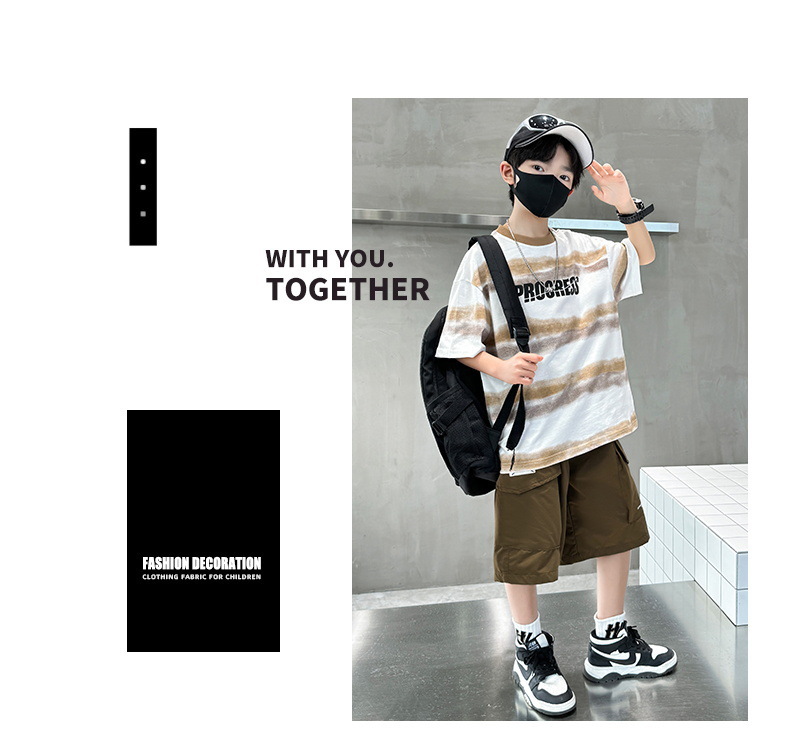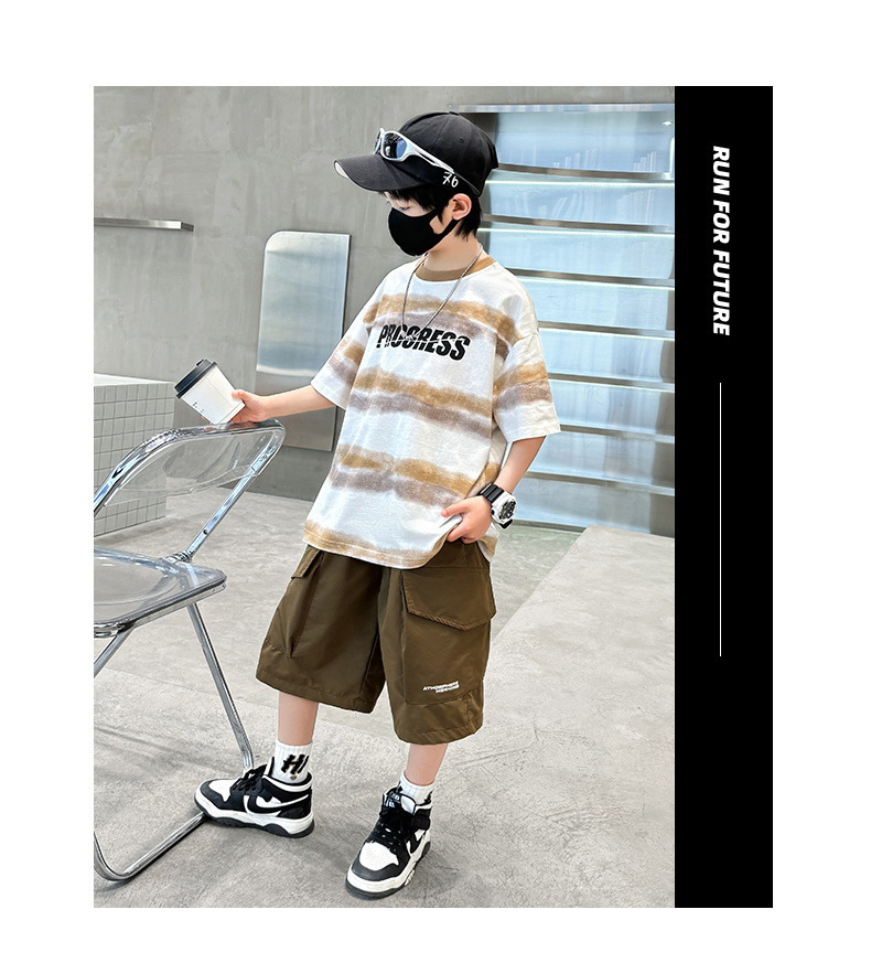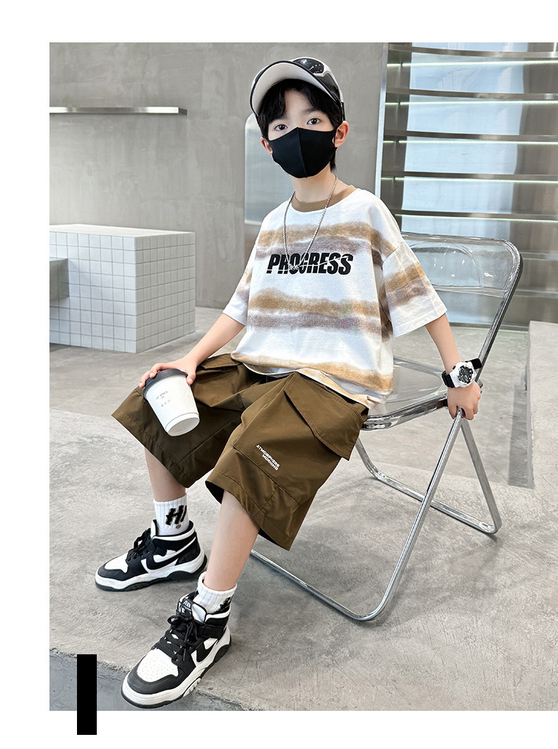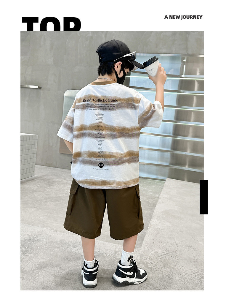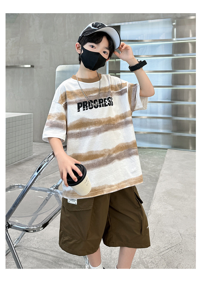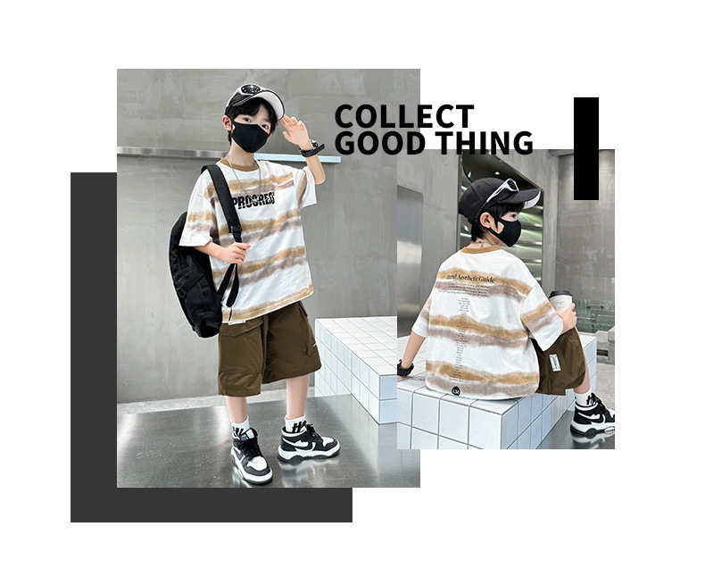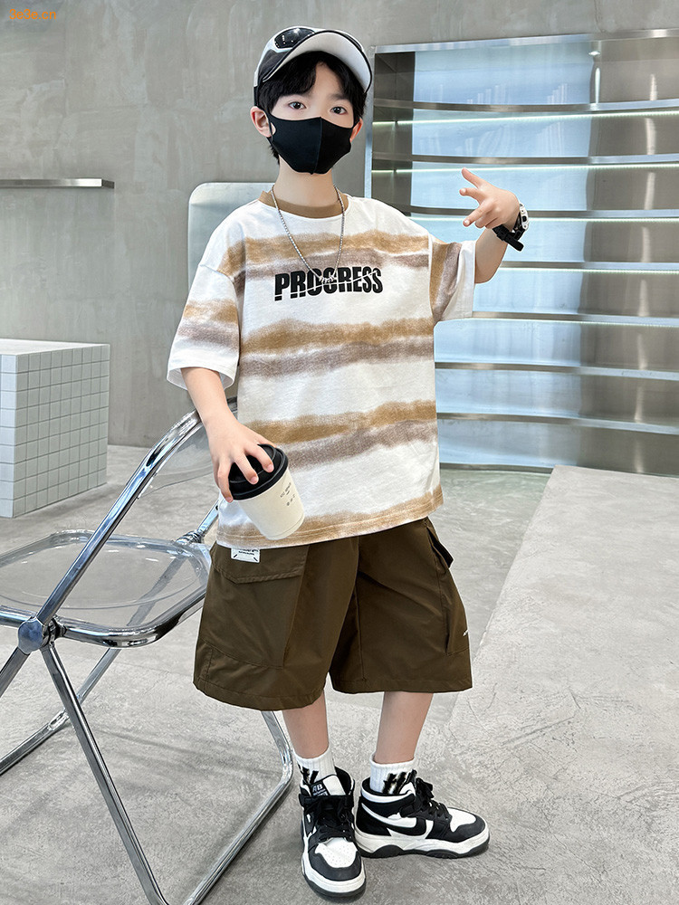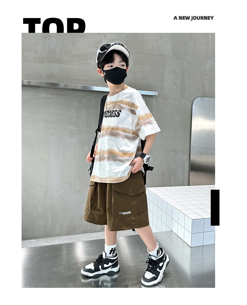 남학생 여름복 줄무늬 편지 반팔 티셔츠 세트 2025 새로운 중대형 어린이 여름 바지 투피스 세트