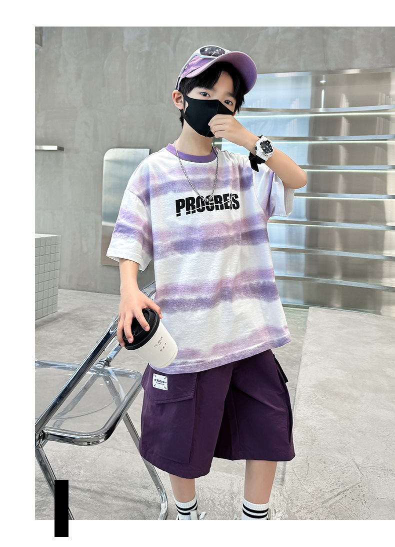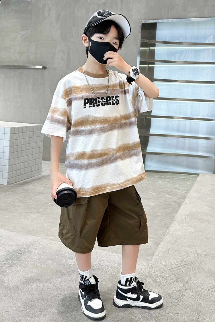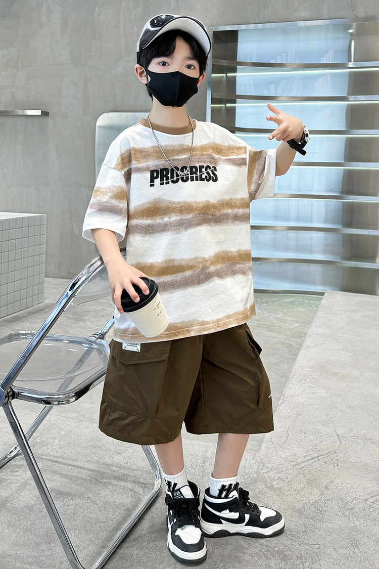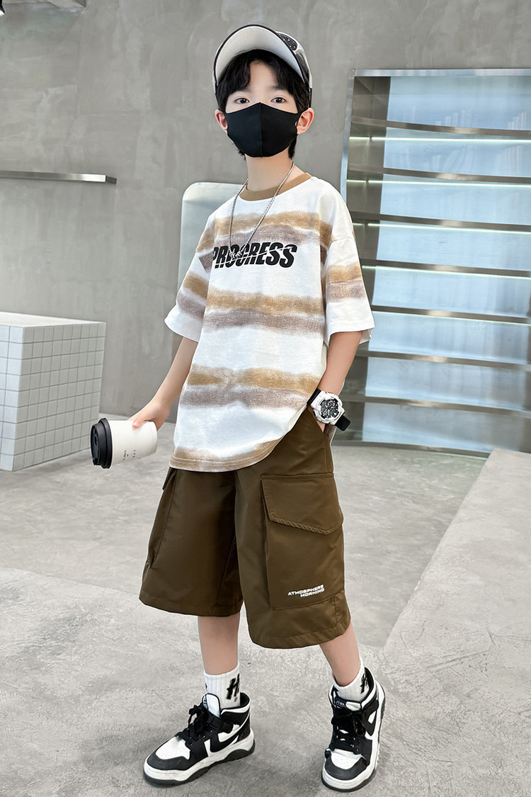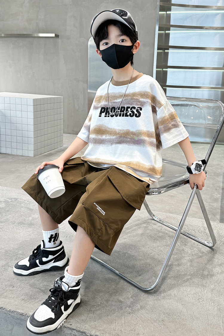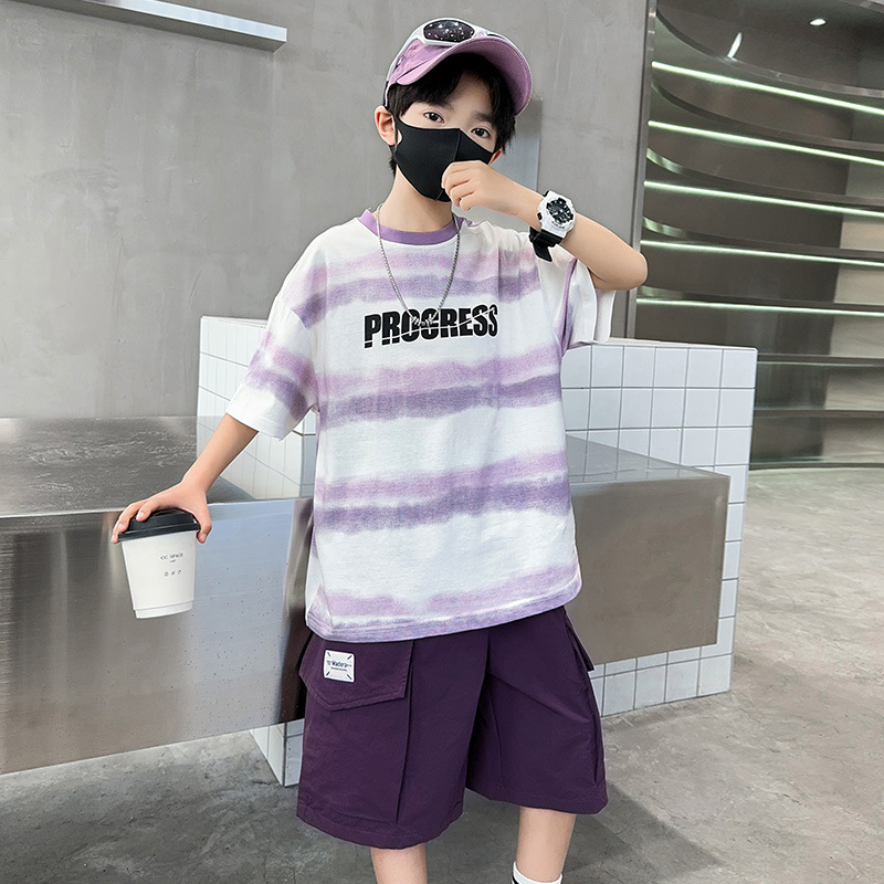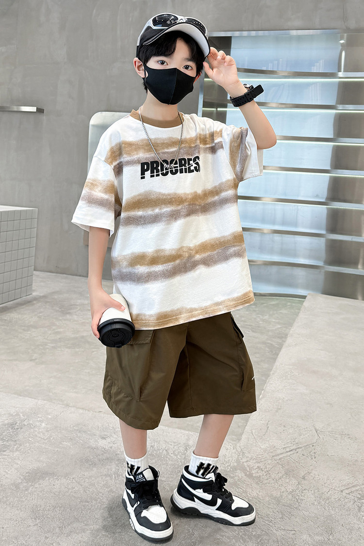 남학생 여름복 줄무늬 편지 반팔 티셔츠 세트 2025 새로운 중대형 어린이 여름 바지 투피스 세트