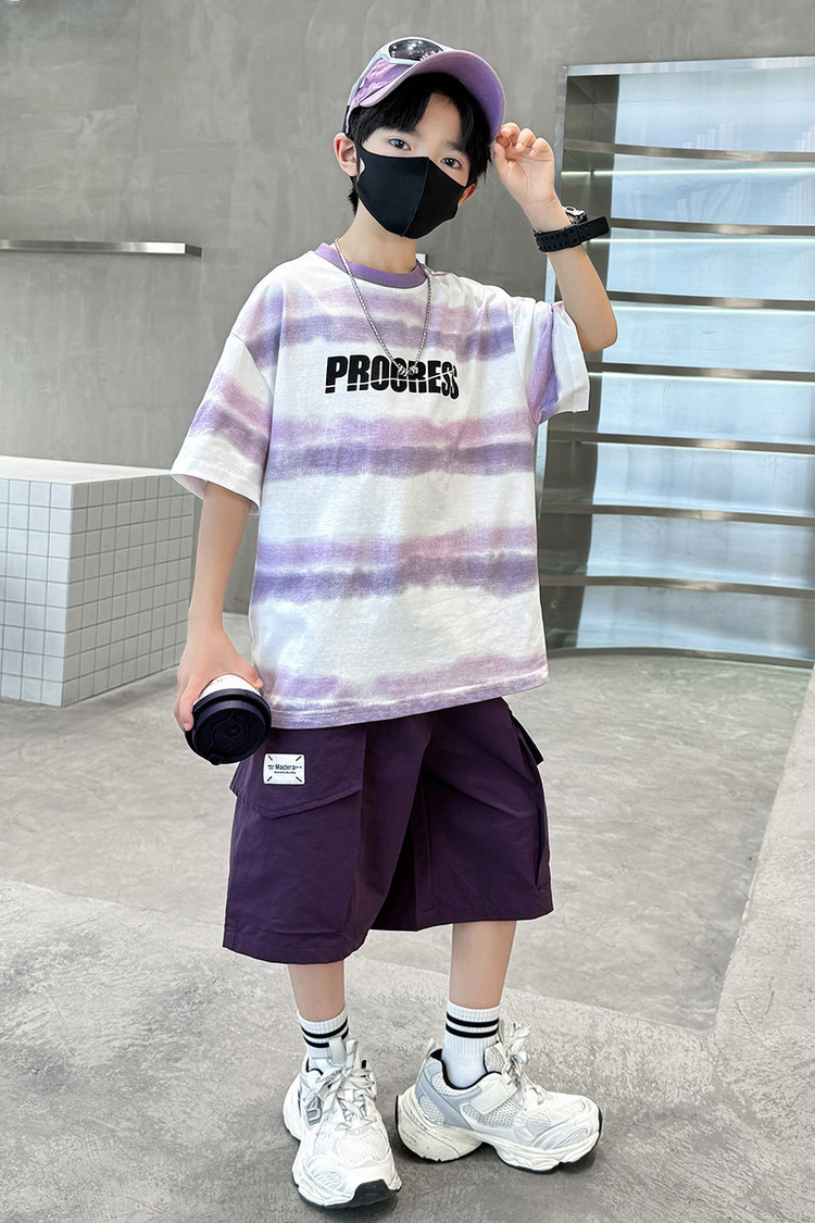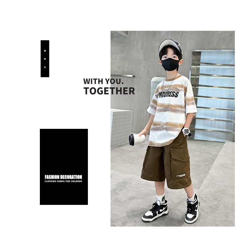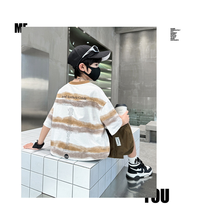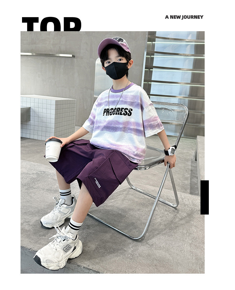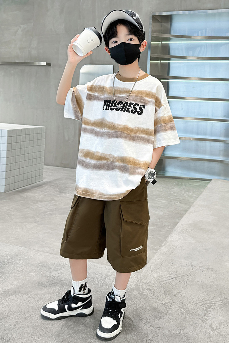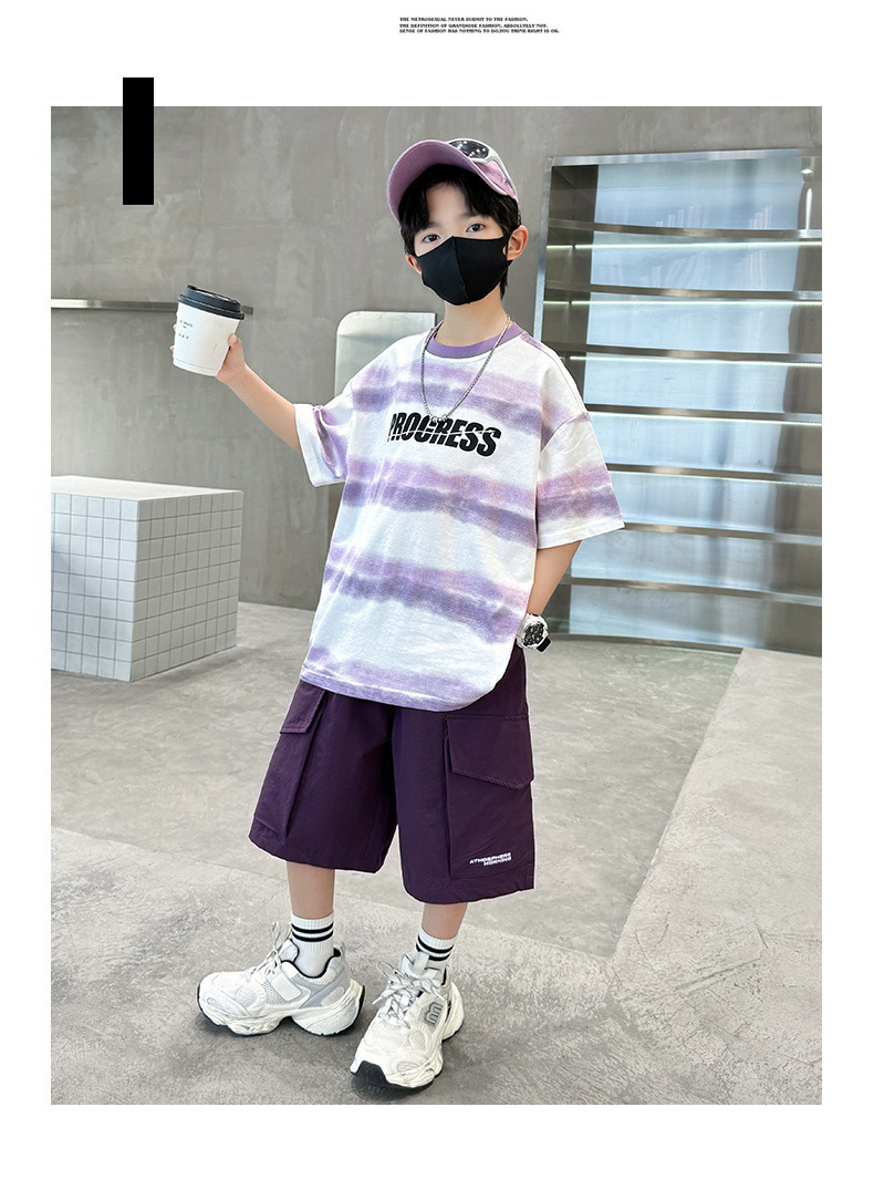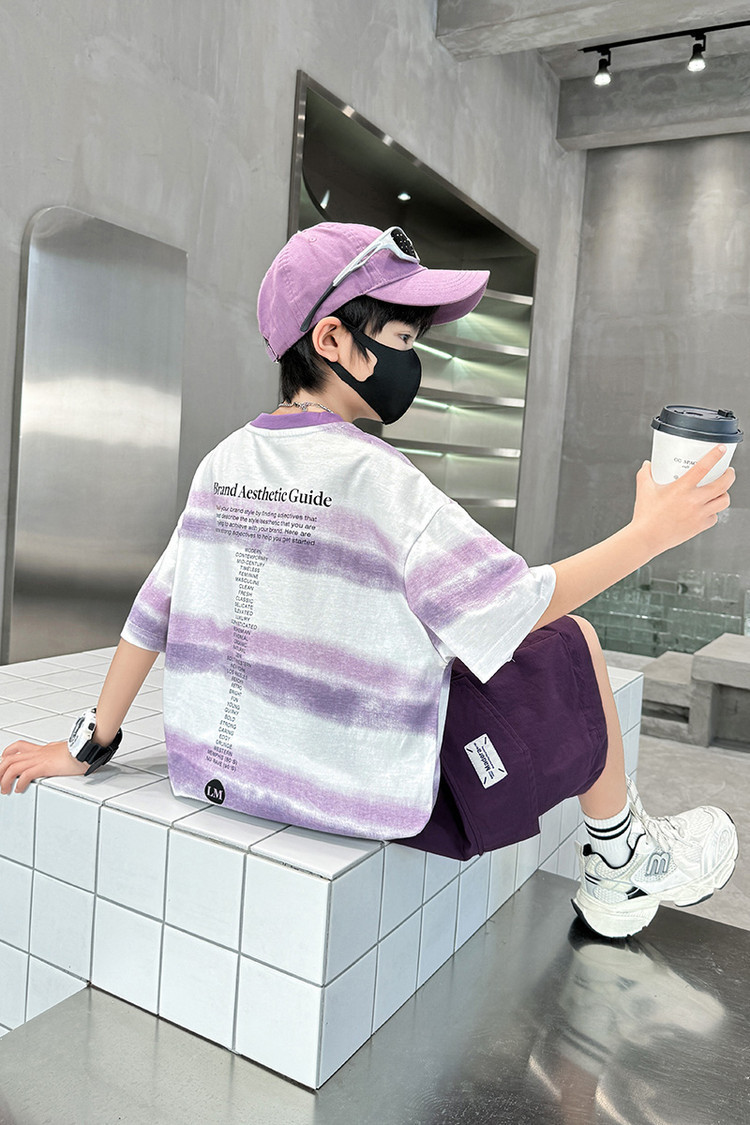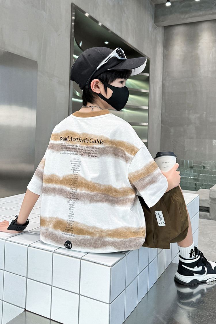 남학생 여름복 줄무늬 편지 반팔 티셔츠 세트 2025 새로운 중대형 어린이 여름 바지 투피스 세트