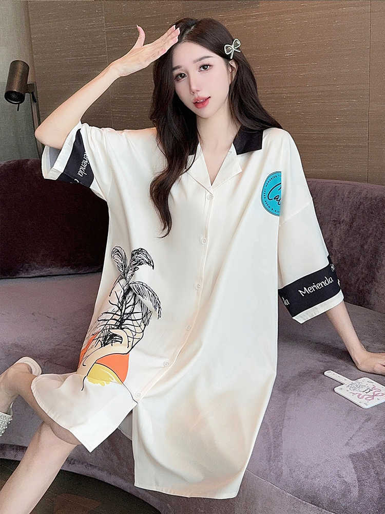 여름 신작 여성 잠옷, 얇고 순수하며 섹시한 아이스 실크 쉬폰 셔츠, 잠옷, 귀여운 홈웨어, 루즈스토어 가기