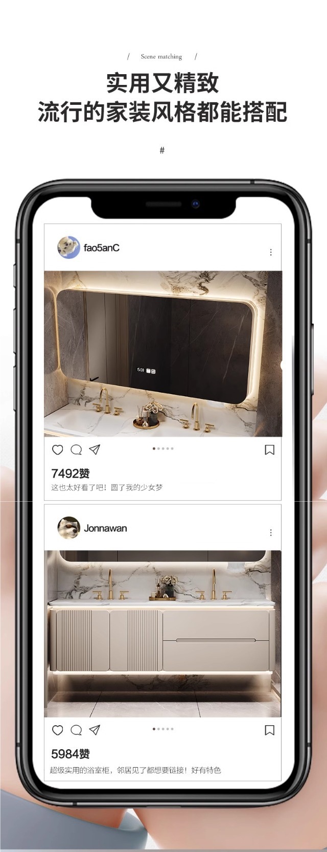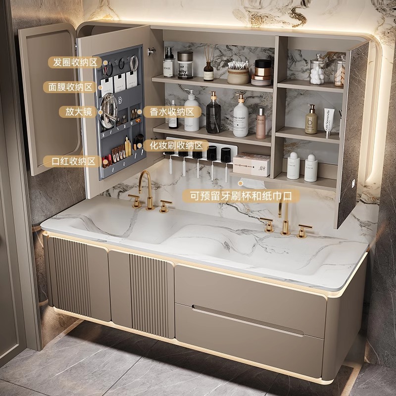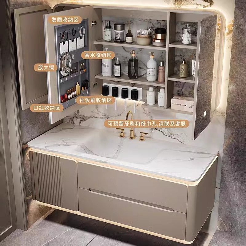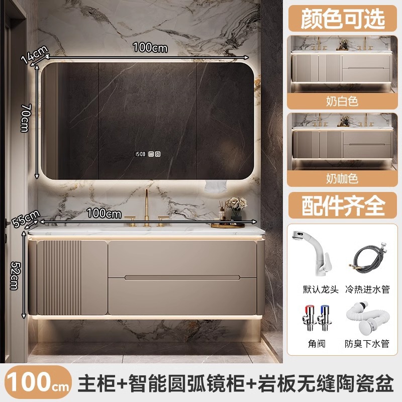 • 100 슬레이트 핫 벤드 세면대 + 원형 스마트 거울 캐비닛 + 오크 캐비닛