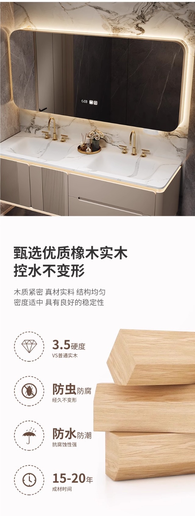 • 160 슬레이트 핫 벤트 이중 세면대 + 원형 스마트 거울 캐비닛 + 오크 캐비닛
