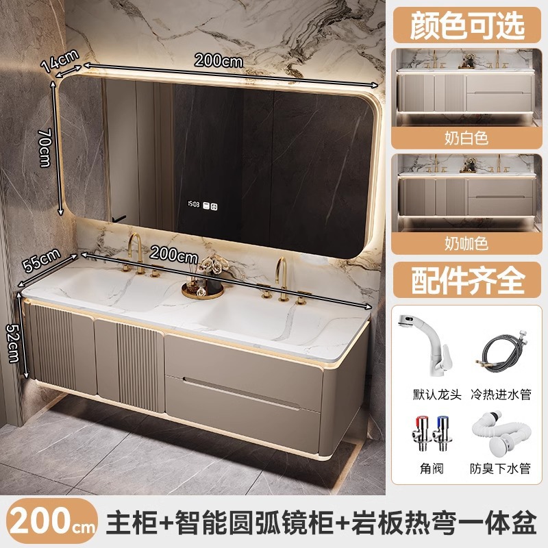 • 200 슬레이트 열 굽힘 이중 세면대 + 원형 스마트 거울 캐비닛 + 오크 캐비닛