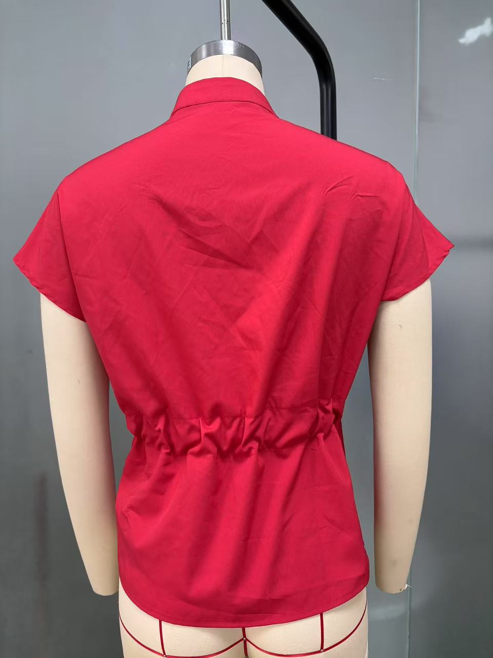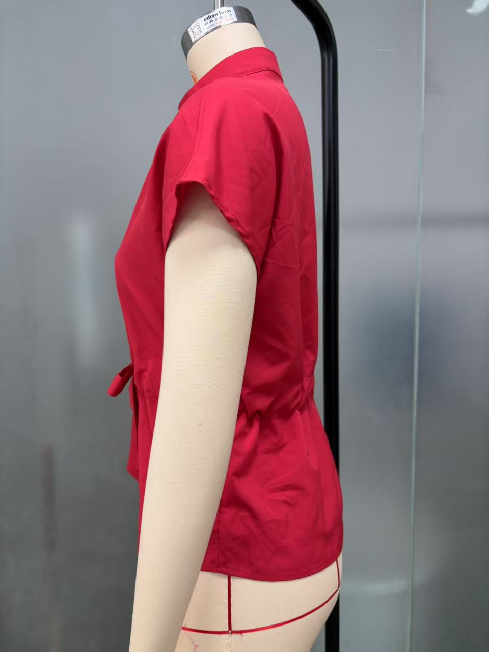 2025 여름 아마존 국경 셔츠 반팔 쉬폰 v 넥 버튼 셔츠 기질 우아한 벨트 스타일 여성 의류