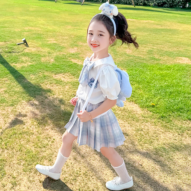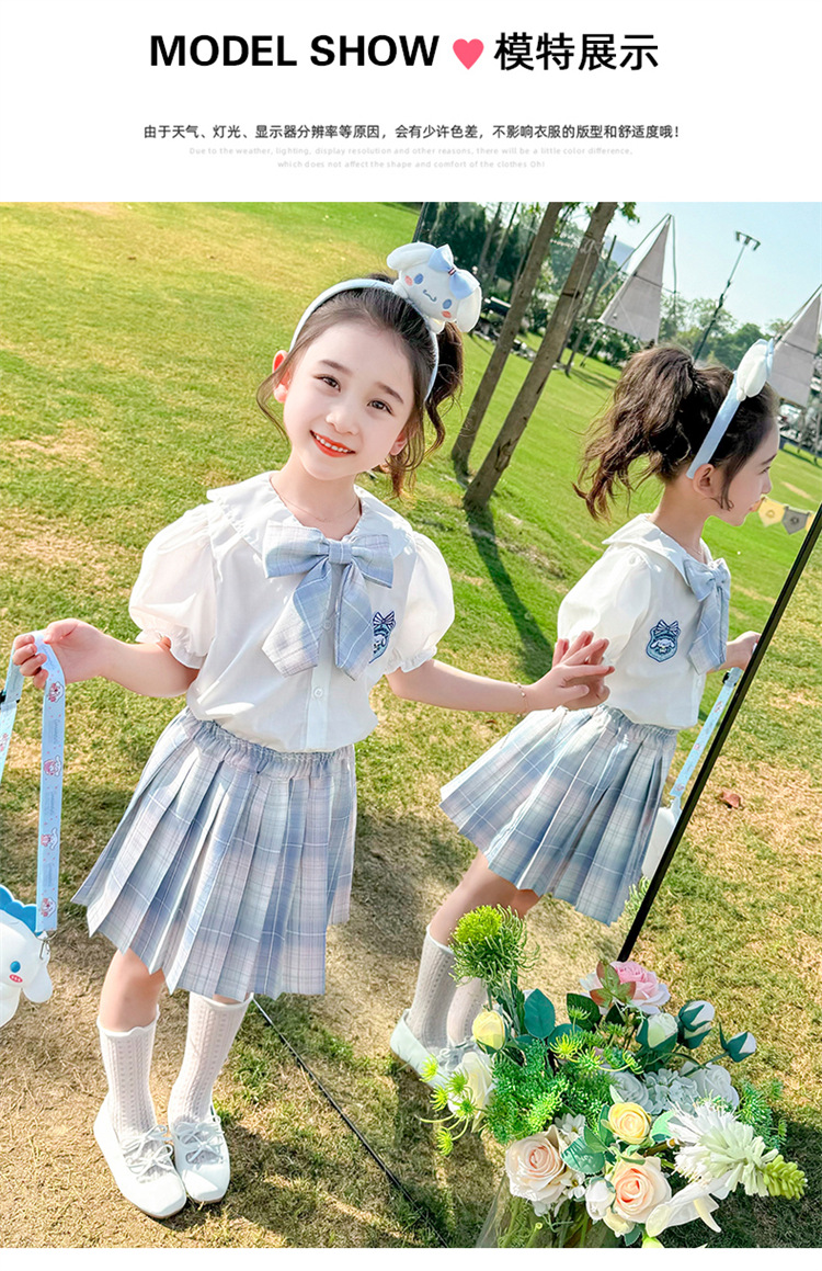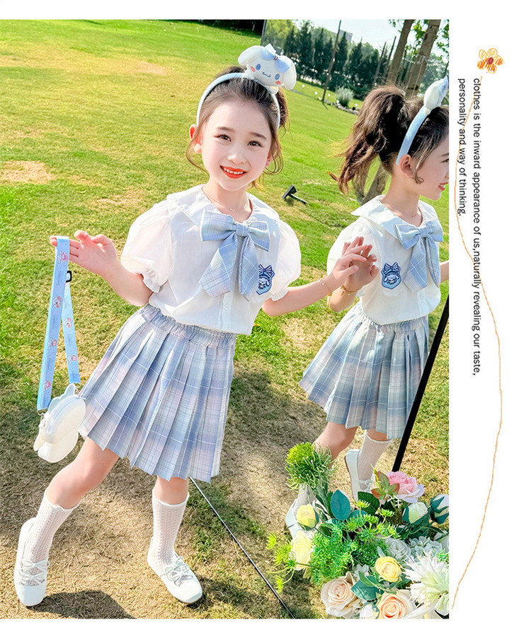 여자 아기 여름 반팔 계피 개 대학 스타일 JK 정장 어린이 대학 스타일 귀여운 셔츠 주름 치마 투피스 세트스토어 가기