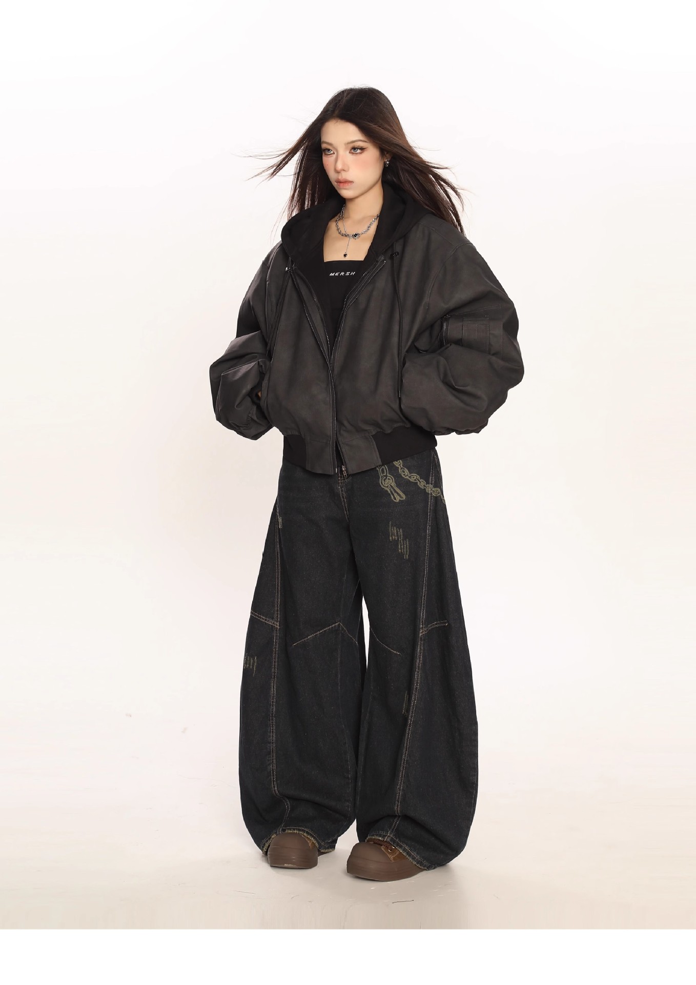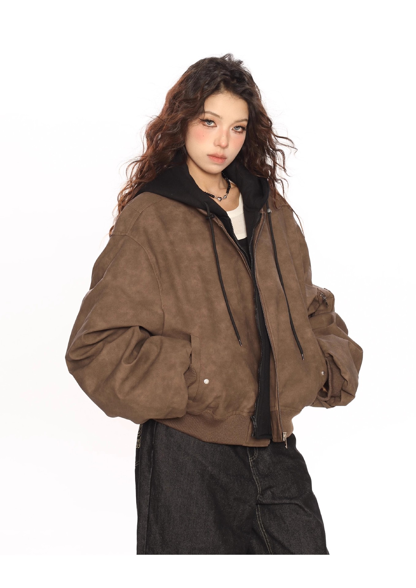 유럽과 미국의 힙합 더블 레이어 페이크 2 피스 후드 가죽 자켓 최고 여성의 봄과 가을 오버 사이즈 듀플렉스 핸섬 올 매치 플라잉 세트스토어 가기