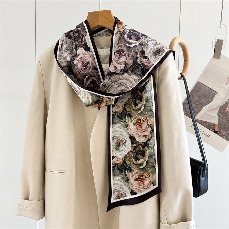 실크 스카프 여성 로즈 스토리 기질 뽕나무 실크 스카프 얇은 좁은 긴 더블 레이어 양면 스카프 리본