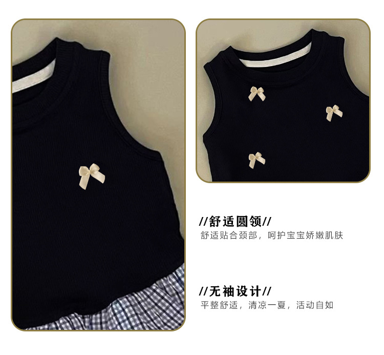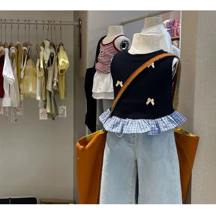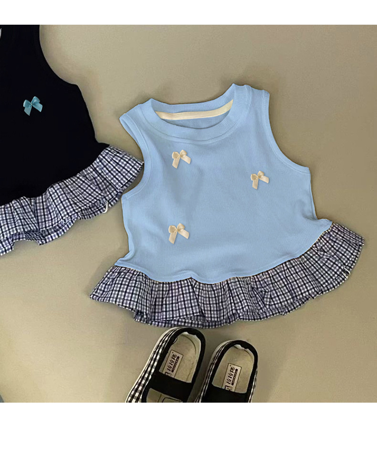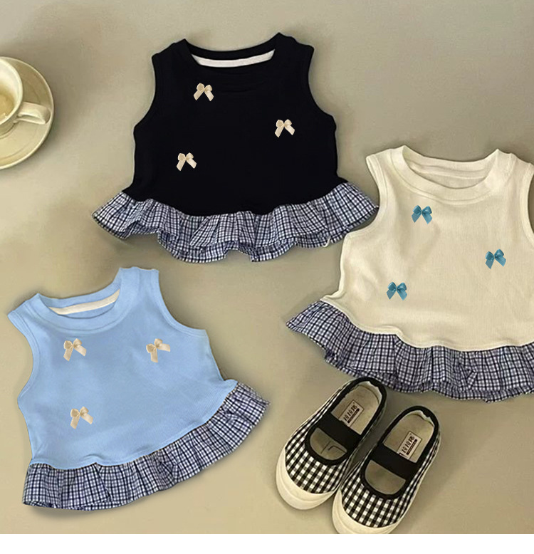 어린이 조끼 톱 2025 여름 새로운 소녀 서양 스타일 달콤한 바느질 블루 격자 무늬 레이스 민소매 티셔츠 트렌디스토어 가기