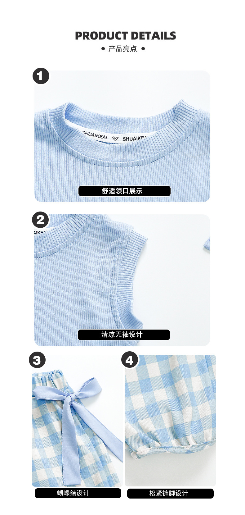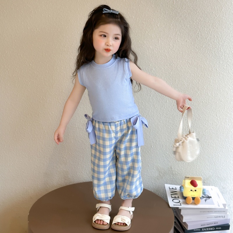 여자 여름 조끼 세트 얇고 세련된 여자 유행 어린이 아기 유행 격자 무늬 바지 민소매 투피스 세트