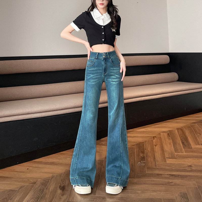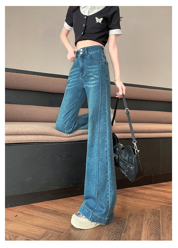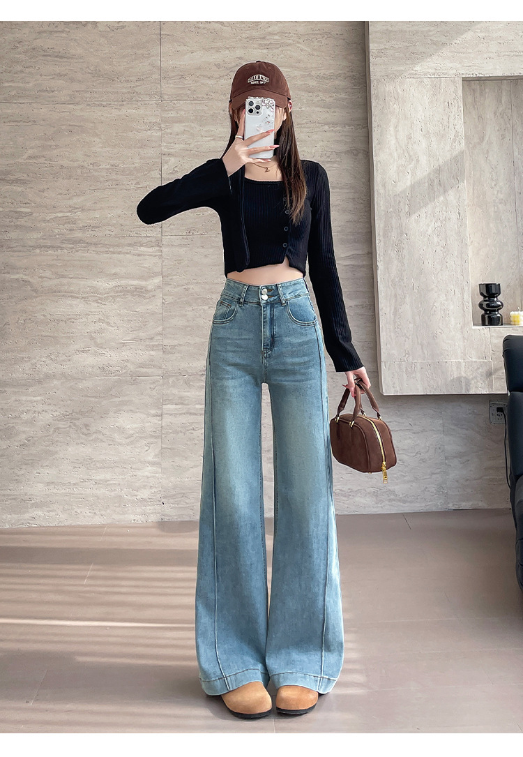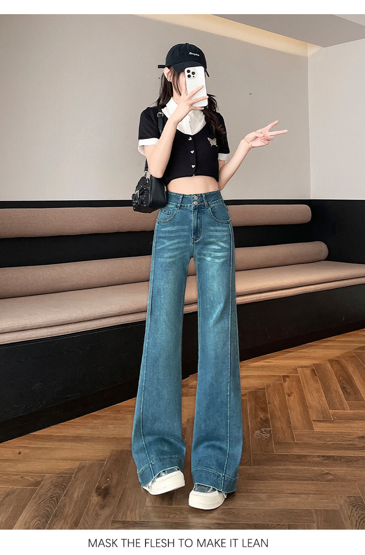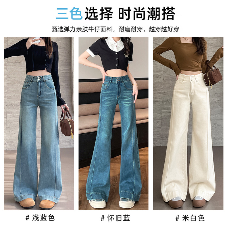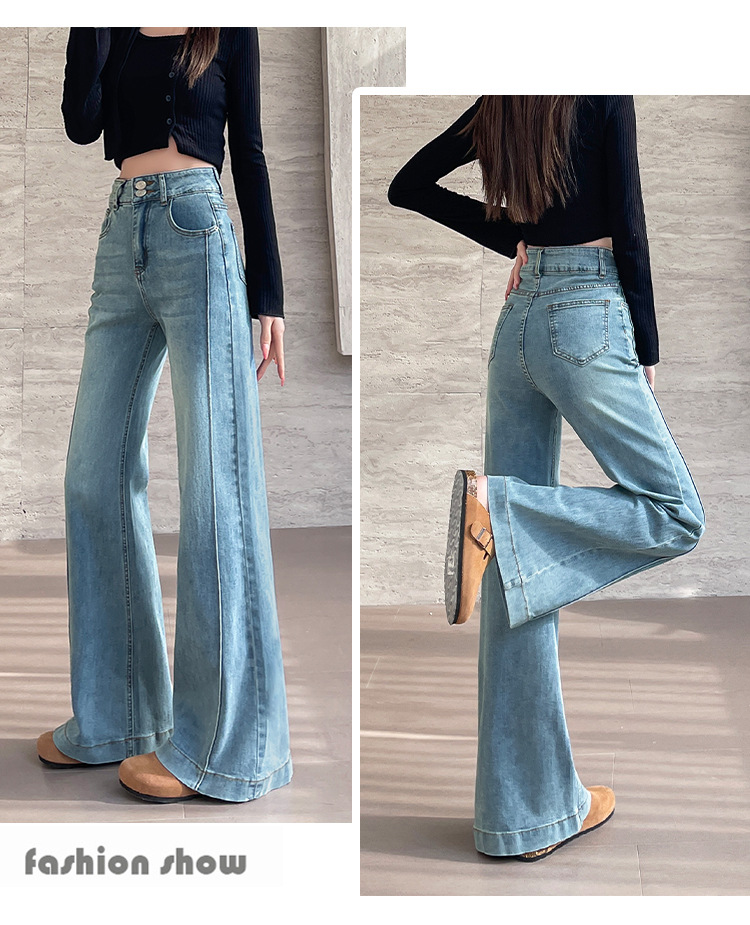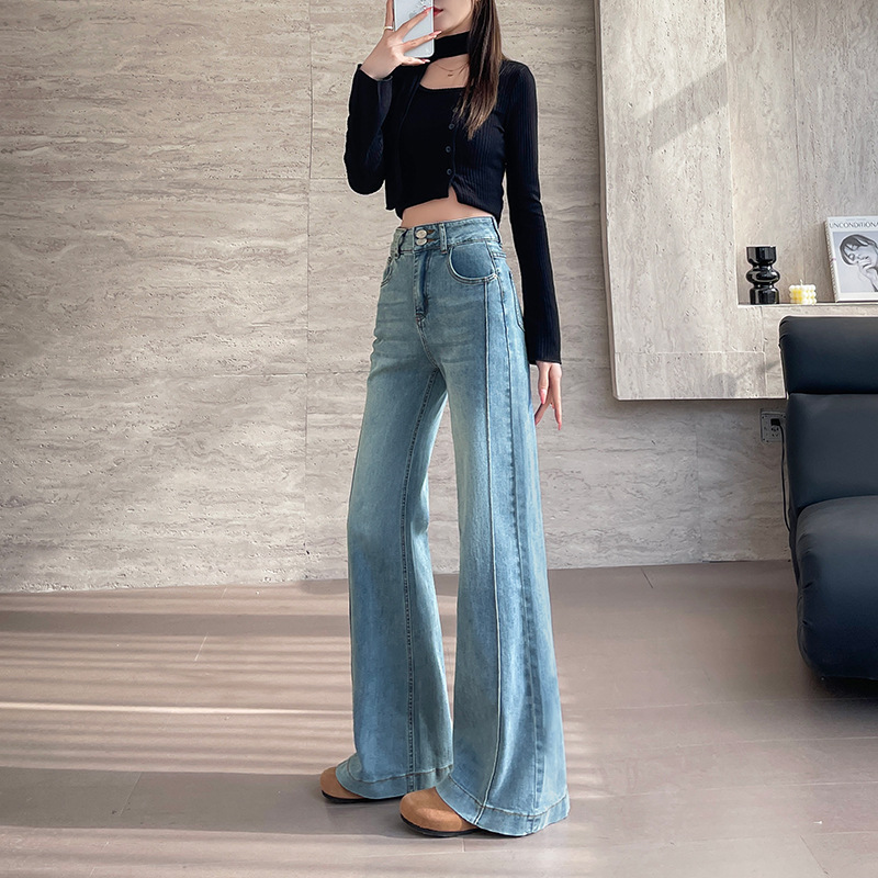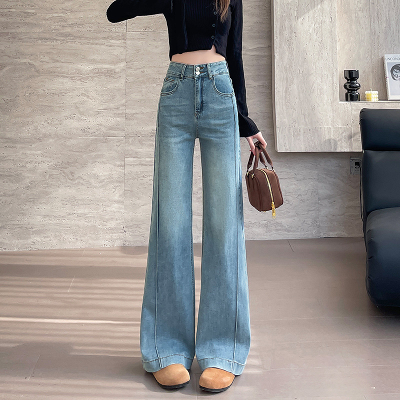 라이트 블루 마이크로 라 청바지 여성의 봄과 가을 새로운 높은 허리 탄성 느슨한 슬림 넓은 다리 바지스토어 가기