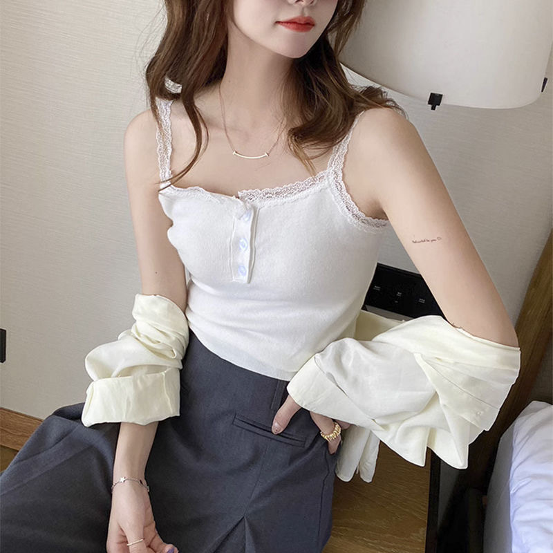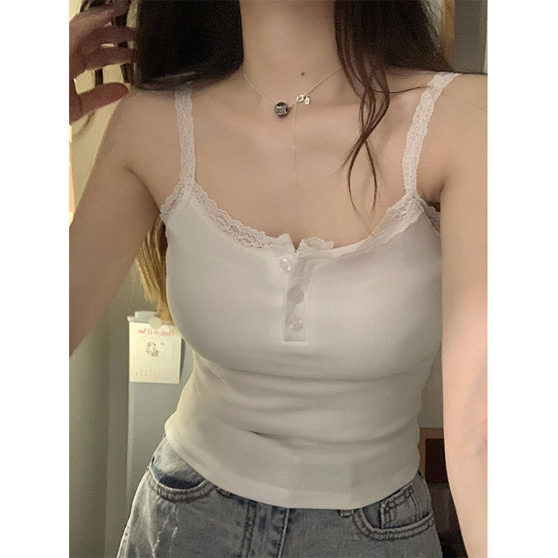 가슴 패드가 있는 여성용 순수한 욕망 버튼 레이스 화이트 캐미솔, 섹시한 아우터웨어, 슬림핏 하의 핫걸 탑