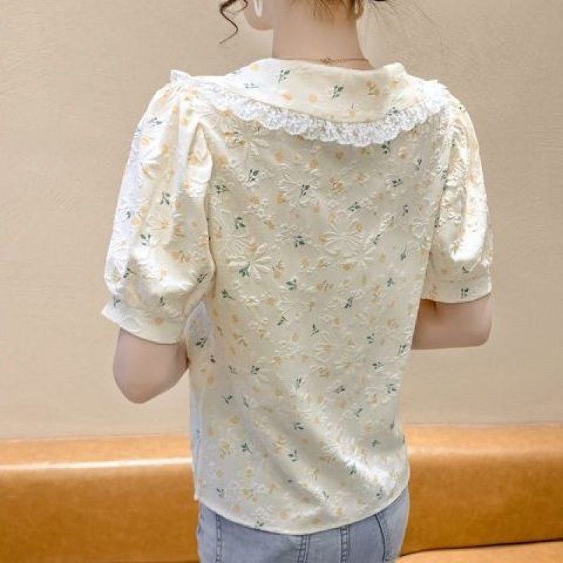 꽃 거품 반팔 톱 2025 여름 새로운 디자인 센스 니쉬 프랑스 여성을위한 달콤한 인형 칼라 탑스토어 가기
